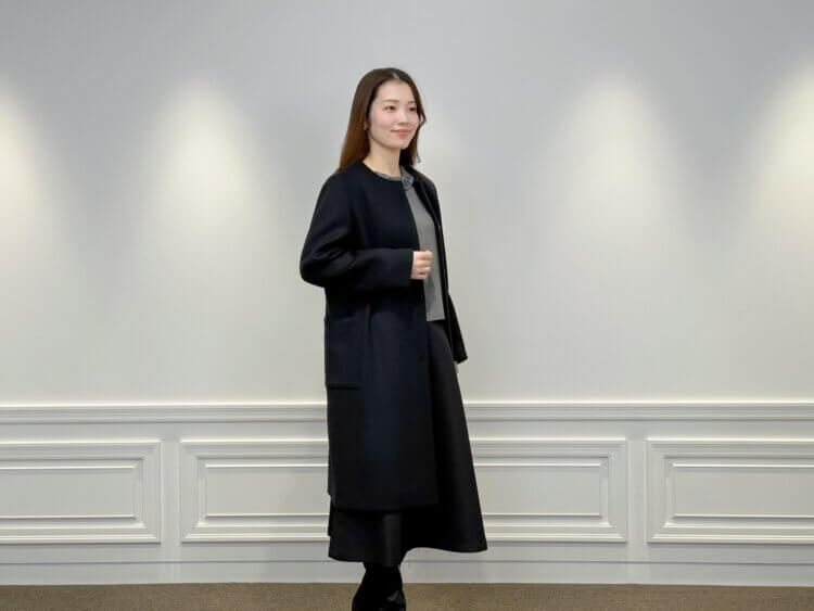 軽やかでしなやかなSuper120’s素材を贅沢に使用し、ロング丈ながら重さを感じさせない仕立てが魅力の<Super120’sベルテッドロングコート>。付属のベルトでウエストを引き締めれば、メリハリのある美しいラインが際立ち、シンプルながら存在感のある一枚です。ブラックでも沈まない、上品な光沢と深みのある色調が大人の冬スタイルを格上げします。