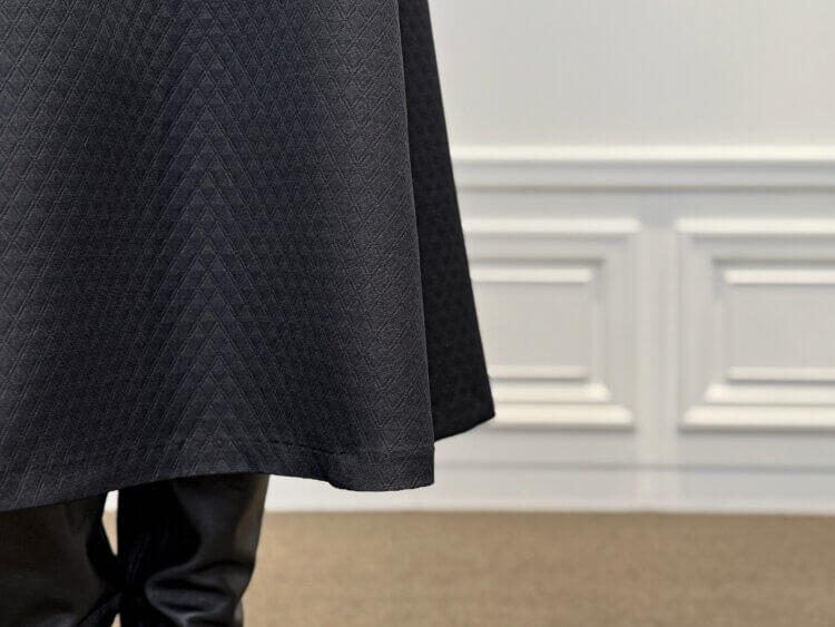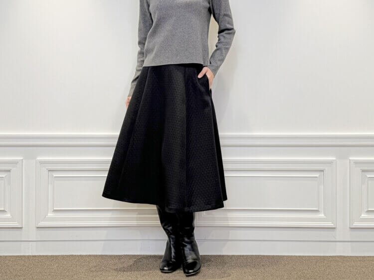 陰影が生む立体感が魅力のジャガード素材を使用した<キルティングジャガードフレアスカート>。歩くたびにふんわりと広がるフレアシルエットが、美しくリュクスな雰囲気を演出します。ブラックながら重たさを感じさせず、素材そのものの奥行きが冬の装いに上品な表情を引き出します。