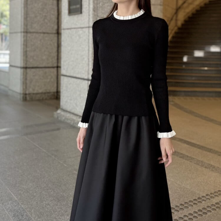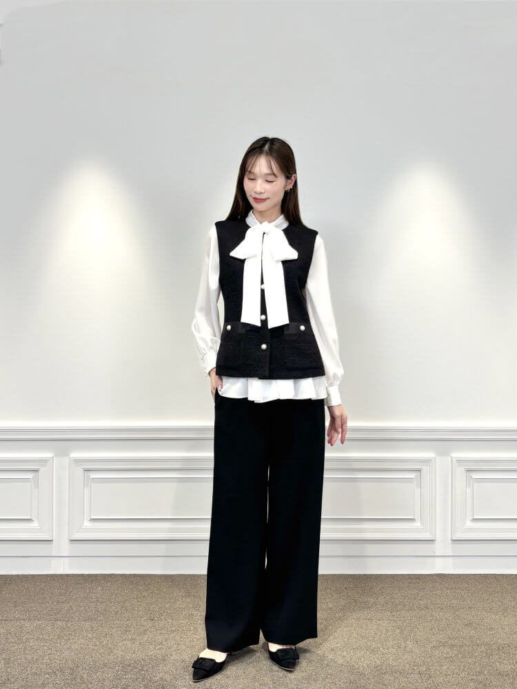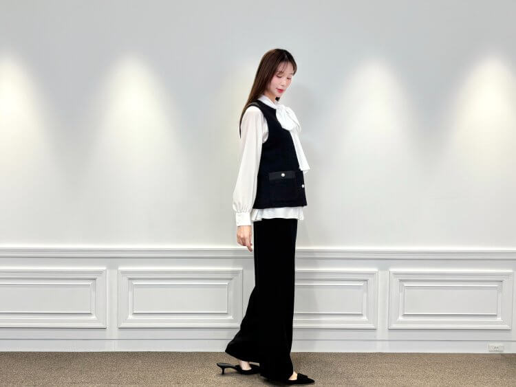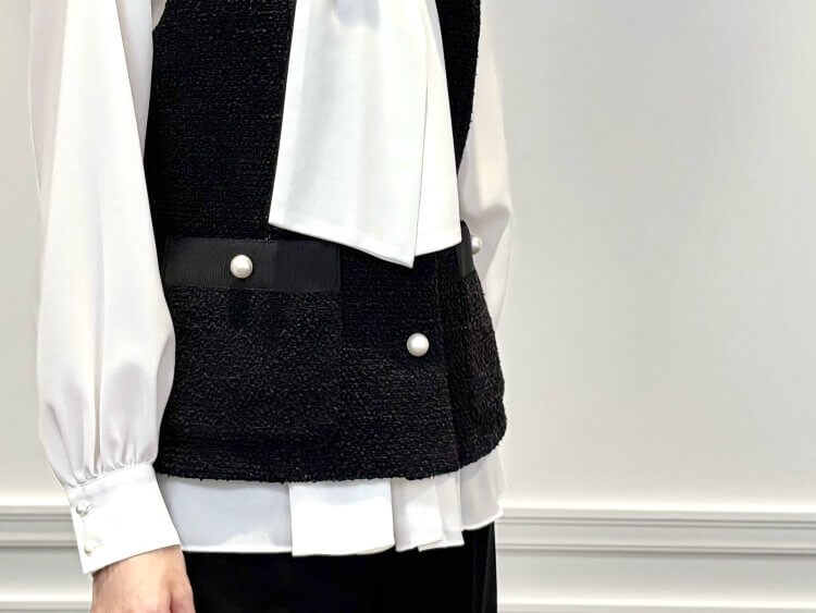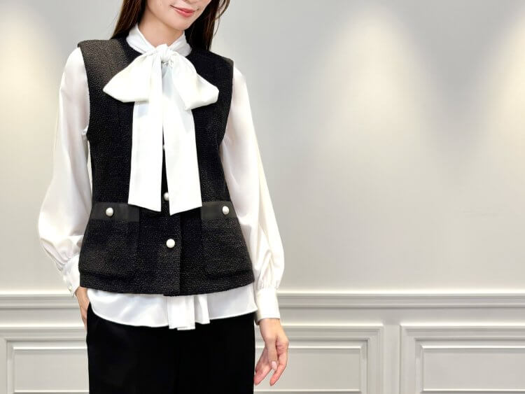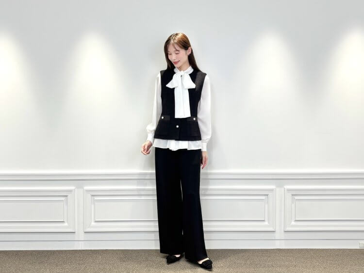 品の良さを感じさせるボウタイブラウスに、パールボタンがアクセントになったニットツイードジレをレイヤード。柔らかなブラウスの質感と、ツイードの上品な表情がマッチし、華やかさの中に知的な印象をプラスしてくれます。