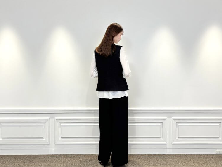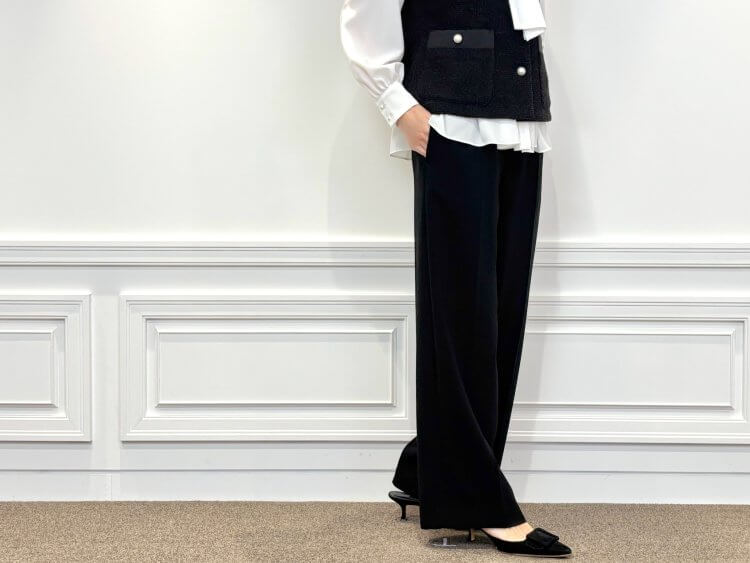 ボトムスにはワイドパンツを合わせることで、堅すぎずリラックス感もあり、動きやすさとエレガンスを両立。さらに足元はフラットシューズで、抜け感をプラスしました。