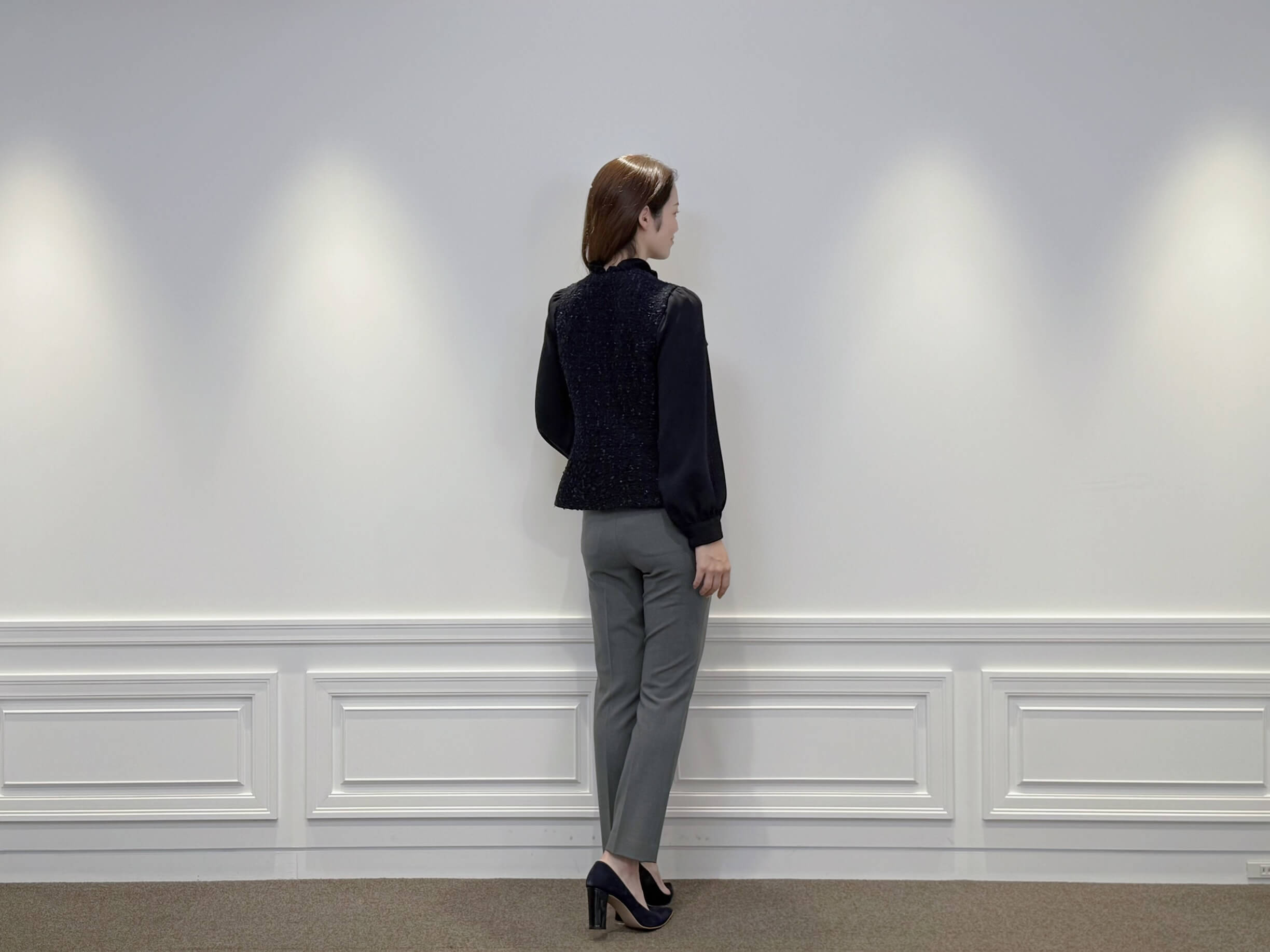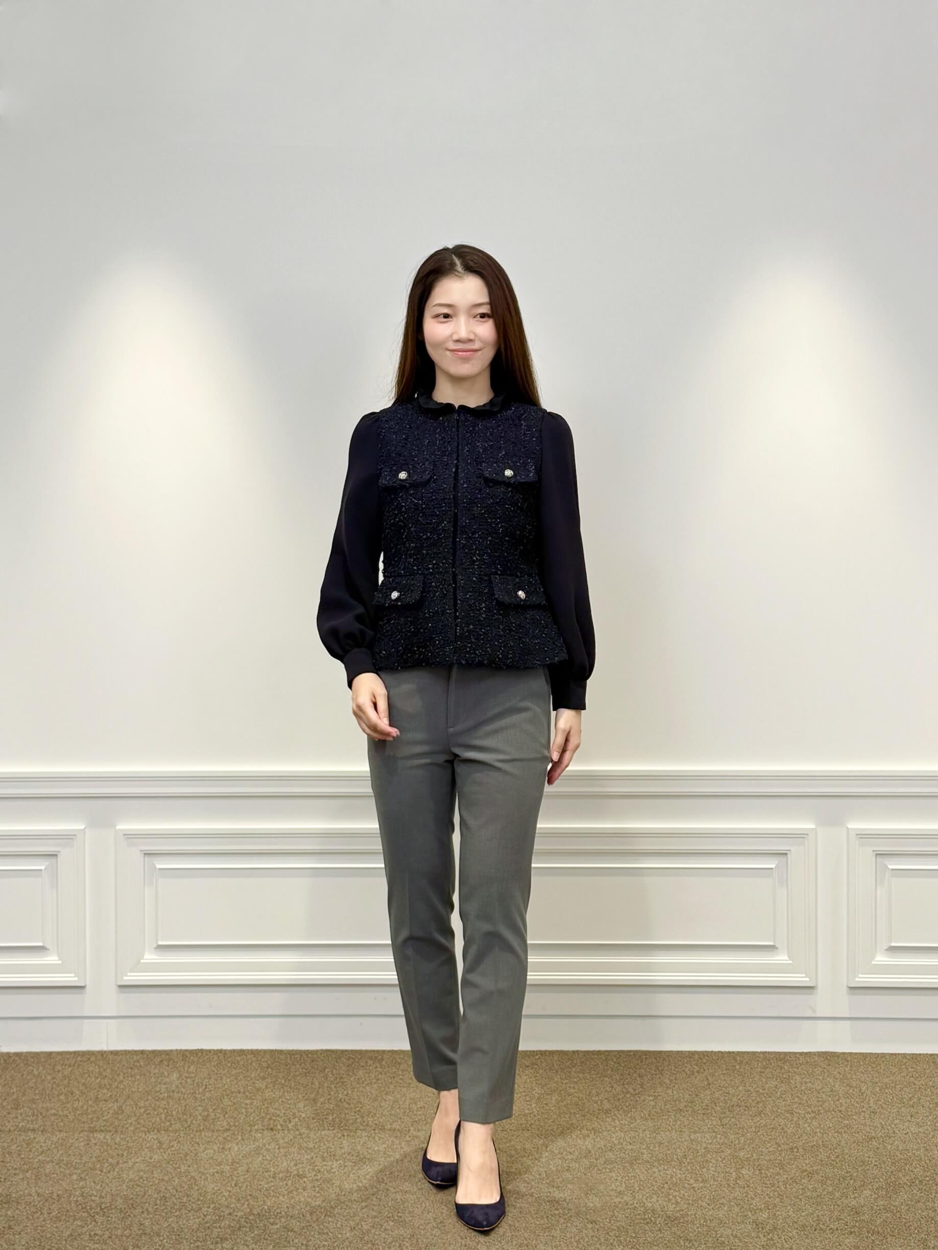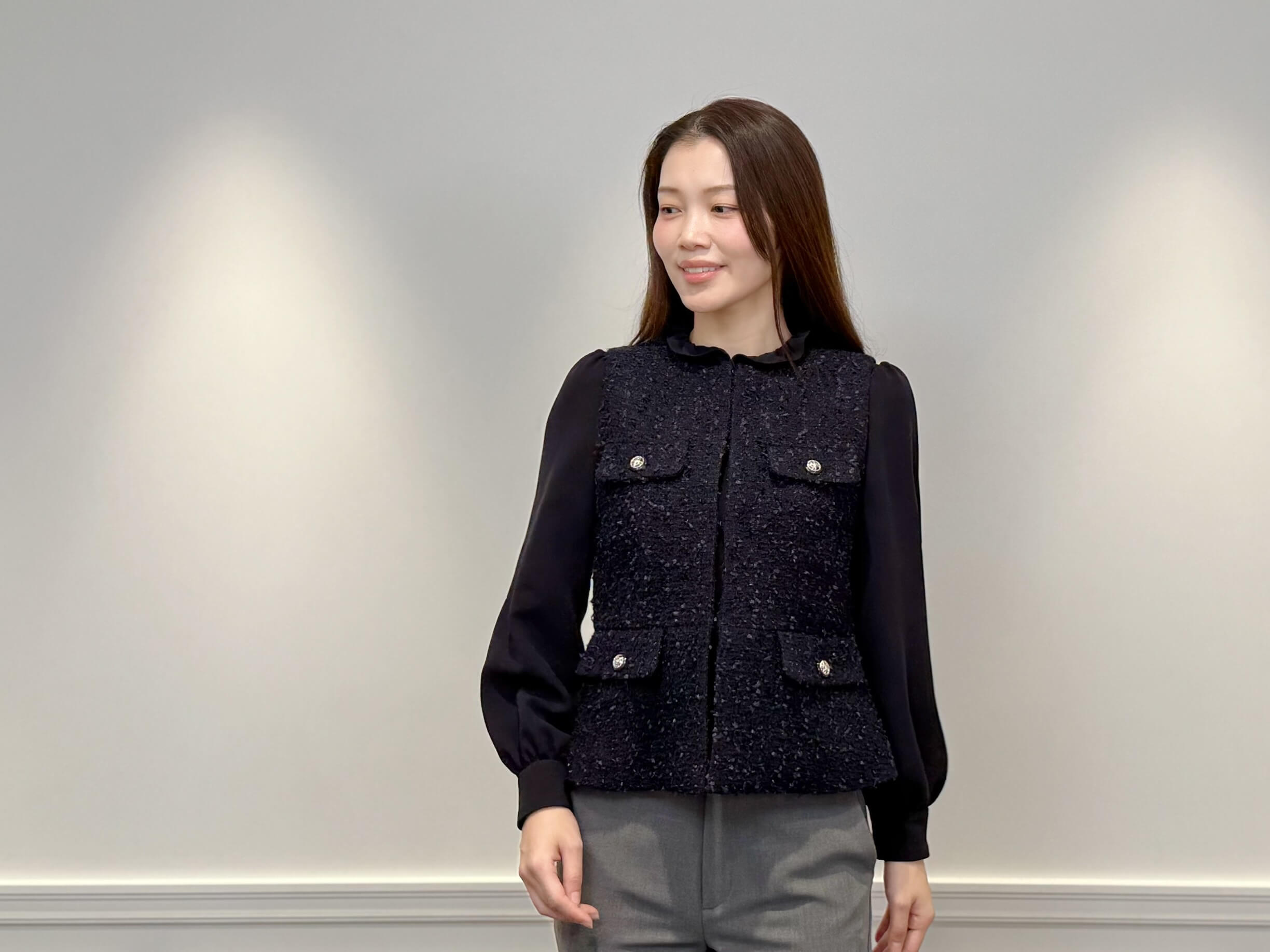 <ファンシーツイードジレ>は、繊細なツイード素材が華やかさを添える一着。ノーカラーデザインが顔まわりをすっきり見せ、コーディネートを上品に引き締めます。軽やかに羽織るだけで着こなしが完成する、頼れるレイヤードアイテムです。