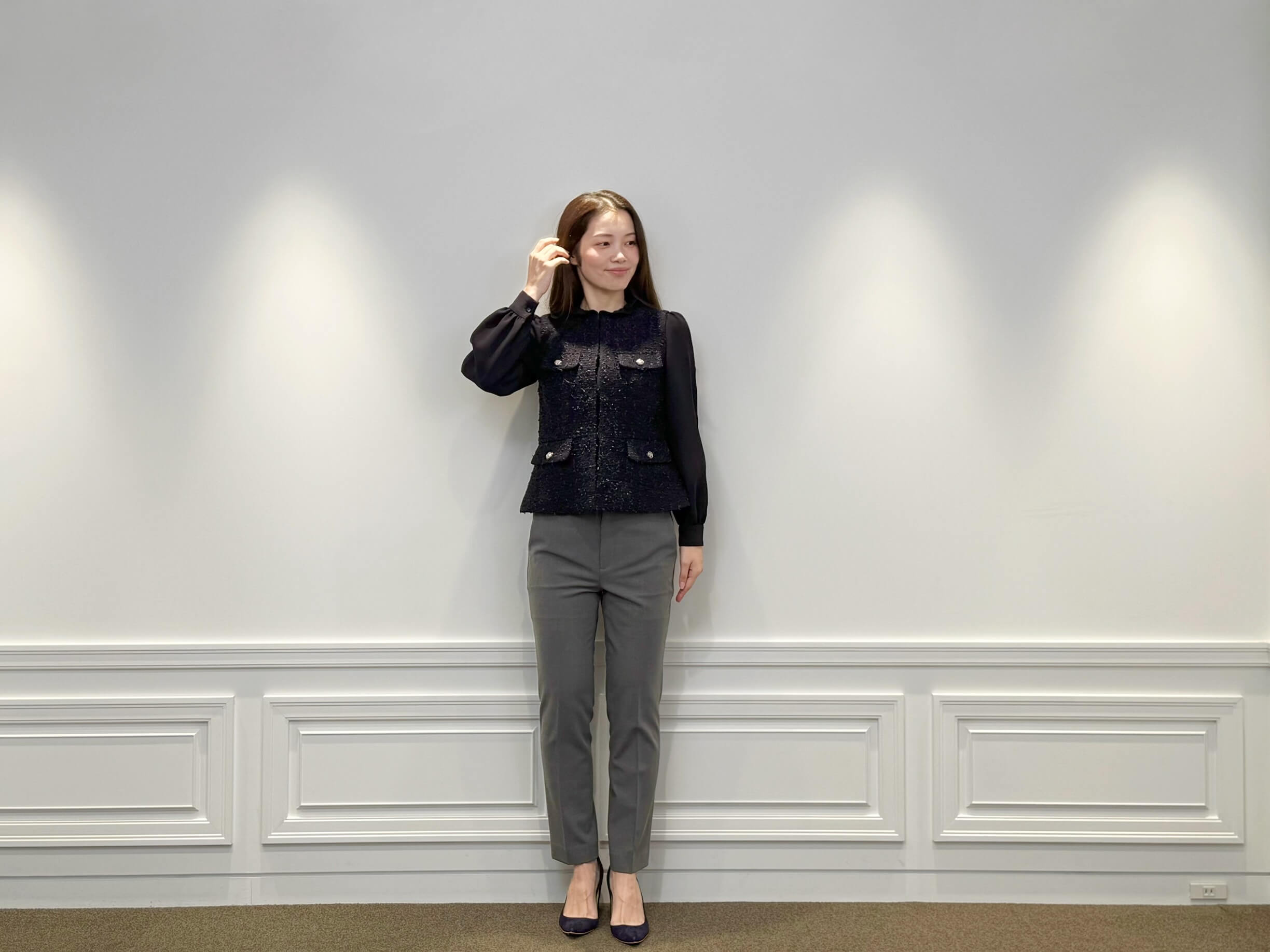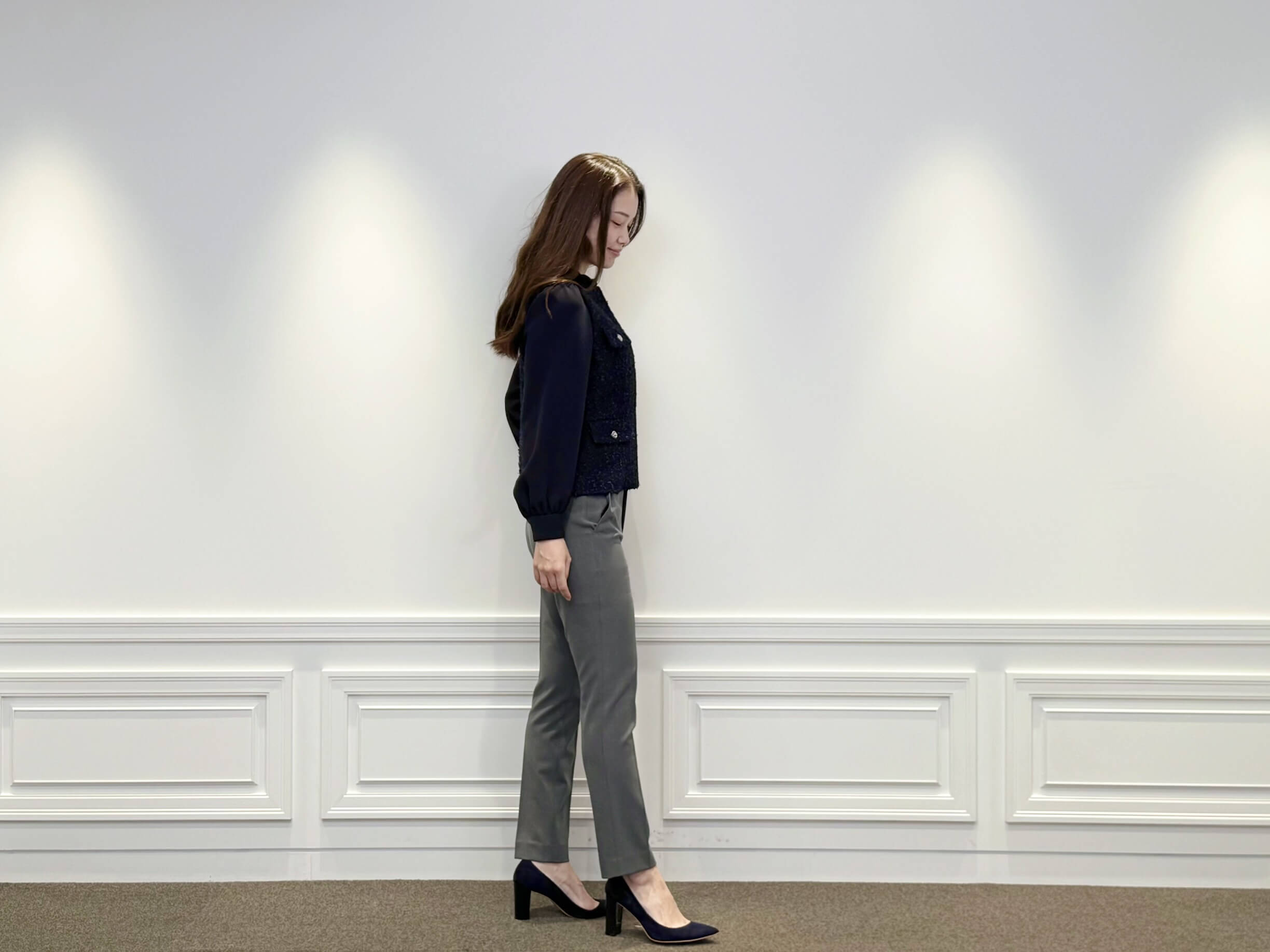 本日は華やぎネイビージレが映えるパンツスタイルをご紹介します!