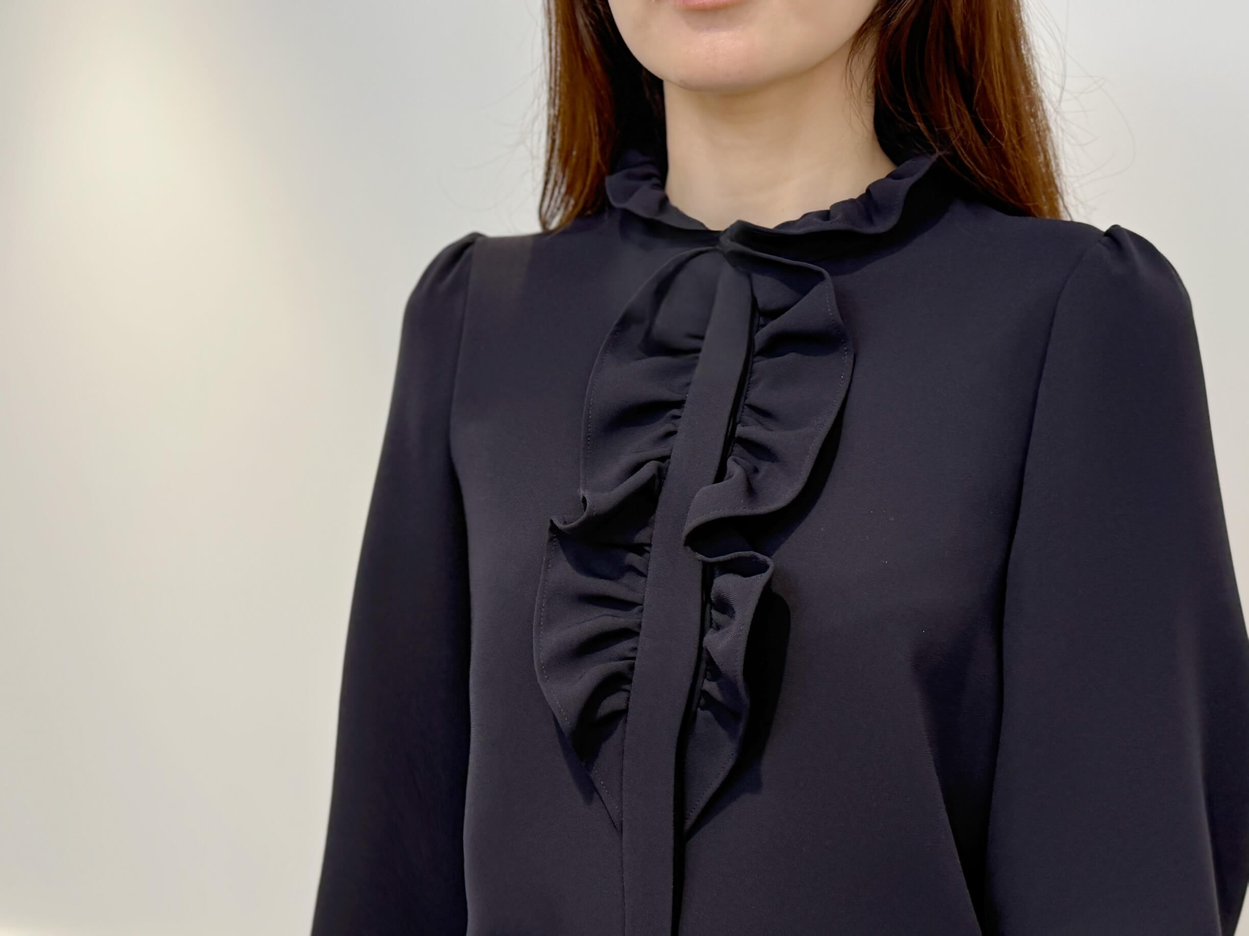 インナーには、優雅なフリルが目を惹ダブルクロスフリルブラウス>をセレクト。程よい肉感と落ち感のあるダブルクロス素材が上質な雰囲気を漂わせ、ジャケットやジレのインにも映える万能ブラウスです。動くたびに揺れるフリルが、エレガントさと柔らかさをプラスしてくれます。