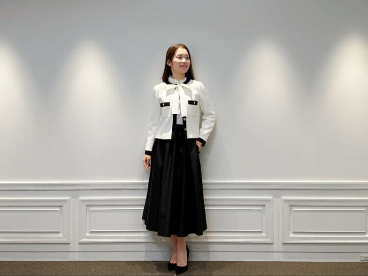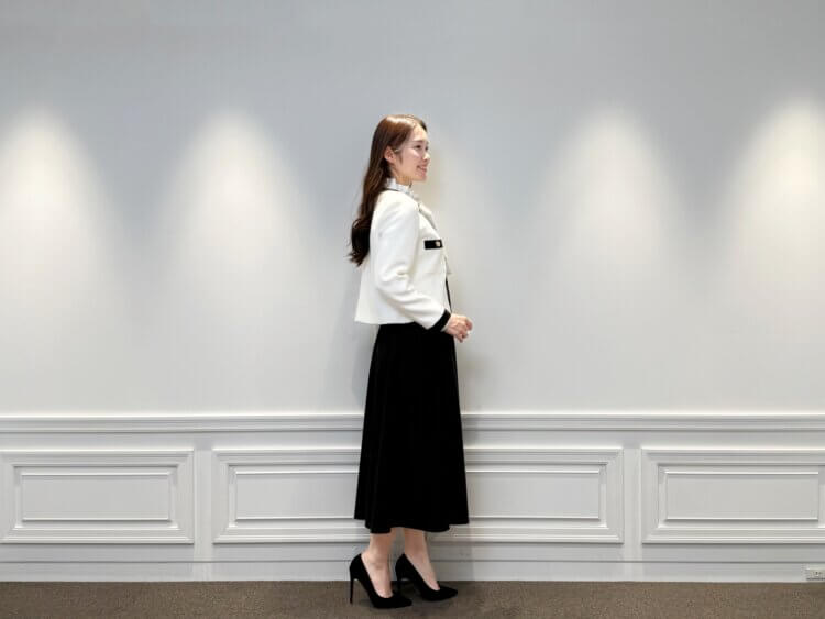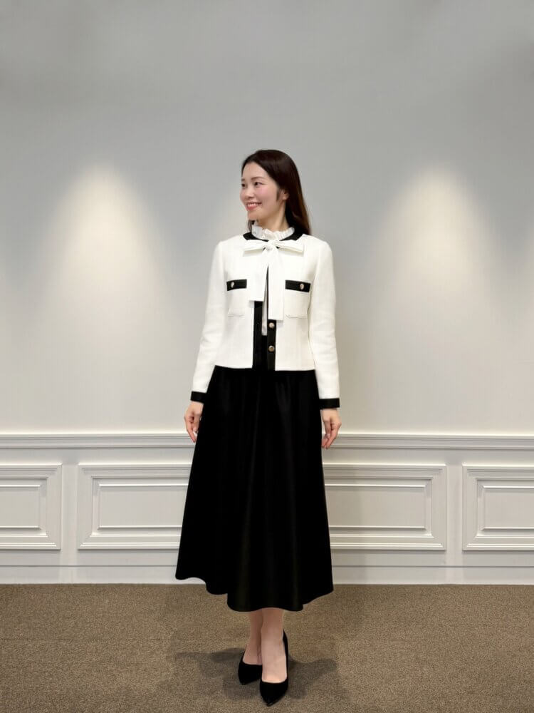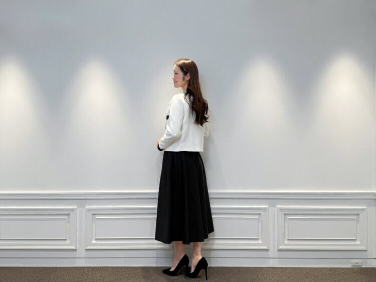 WHITE×BLACKのコントラストが美しいツイードジャケットに、同色のブラウスとブラックスカートを合わせた、凛とした佇まいが印象的なスタイリングです。甘さを抑えた配色バランスが、大人の女性らしい知性と落ち着きを演出。きちんと感がありながらも、華やぎを忘れない装いは、通勤から会食、セレモニーシーンまで幅広く活躍します。足元には黒のパンプスを合わせ、全体を引き締めることで、より完成度の高い印象に仕上げました。
