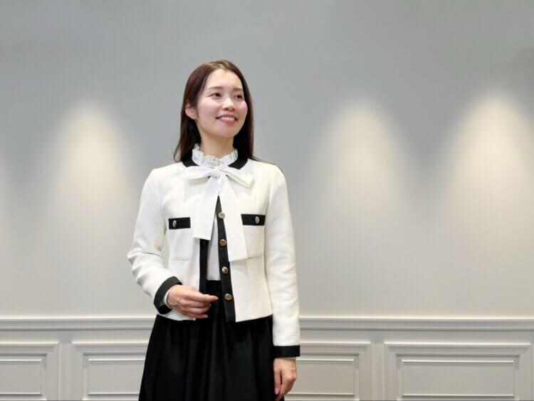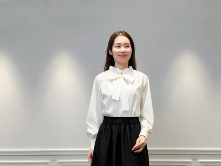 インナーに合わせた<フリルネックボウタイリボンブラウス>は、首元に程よい華やかさを添え、ツイードジャケットのクラシカルな雰囲気を一層引き立てます。柔らかな表情のフリルとボウタイデザインが、顔まわりを上品に演出し、ジャケットスタイルに女性らしいニュアンスをプラス。ホワイトカラーを選ぶことで、全体の配色に軽やかさが生まれ、洗練された印象に仕上がります。