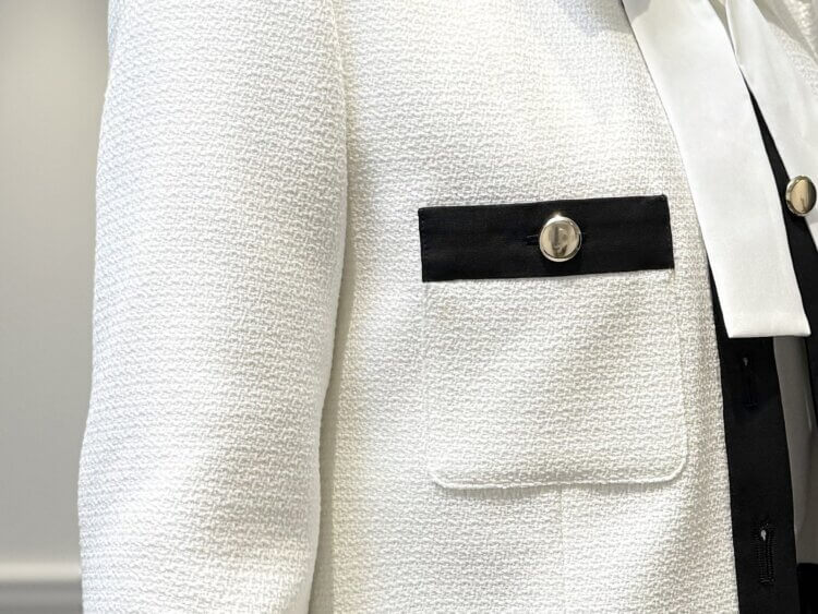 ゴールドボタンが映える白×黒ツイードで完成する、エレガントな大人の正統派スタイル