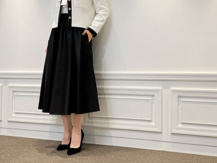 ボトムには、<ウエストゴムギャザーフレアスカート>を合わせ、エレガントさと快適な着心地を両立しました。上品な光沢とほどよいハリ感のある素材が、動くたびに美しく広がり、女性らしいシルエットを演出します。総ゴム仕様でストレスフリーな履き心地ながら、きちんと感を損なわない点も魅力。両サイドのポケットが実用性を高め、オンオフ問わず活躍する頼れる一枚です。