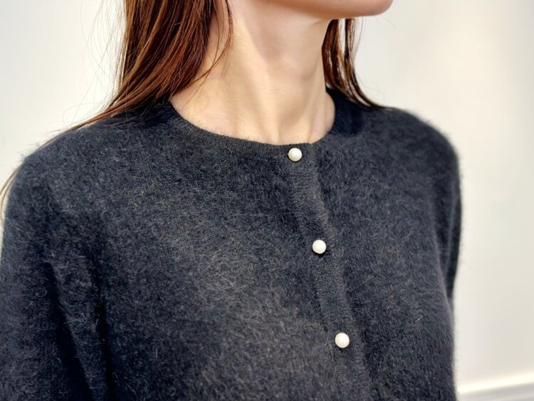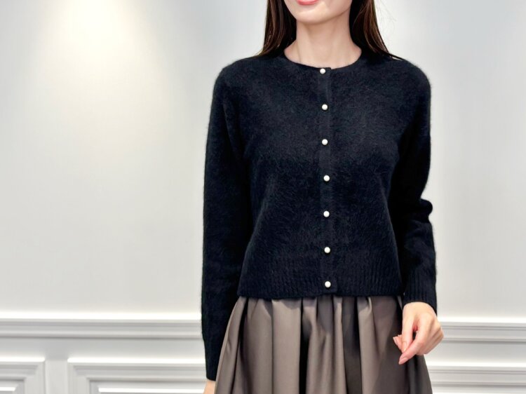 トップスにはパールボタンがあしらわれた、顔まわりを明るく華やかに演出する<パールボタンファーニットカーディガン>。フォックス50%×ヤク50%の素材を使用したふんわりとしたフォルムが、冬のコーディネートに暖かく華やかさを添えます。思わず触れたくなるような、大人のリュクスな着こなしにおすすめの一枚です。