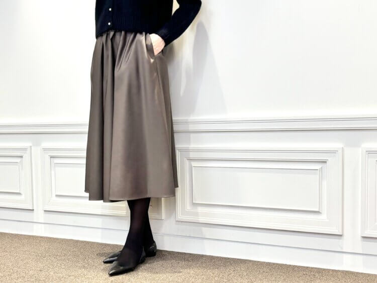 膝下長めの丈感のスカートで、歩くたびに美しく揺れるシルエットが魅力。気になるラインを自然にカバーしつつ、縦のラインを強調してくれるので、上品さとスタイルアップを同時に叶えてくれます。落ち着いたモカカラーがやわらかさを添え、ブラックのトップスとのコントラストで大人らしい雰囲気に仕上がります。