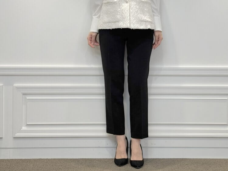 <ダブルクロスセンタープレステーパードパンツ>は、すっきりとしたシルエットとセンタープレスが生み出す縦のラインが魅力。ブラックカラーが全体を引き締め、ホワイトのトップスをより一層際立たせます。端正なフォルムは通勤や改まった席にもふさわしく、ジレの存在感を受け止めながらスタイルをシャープに整える一本です。