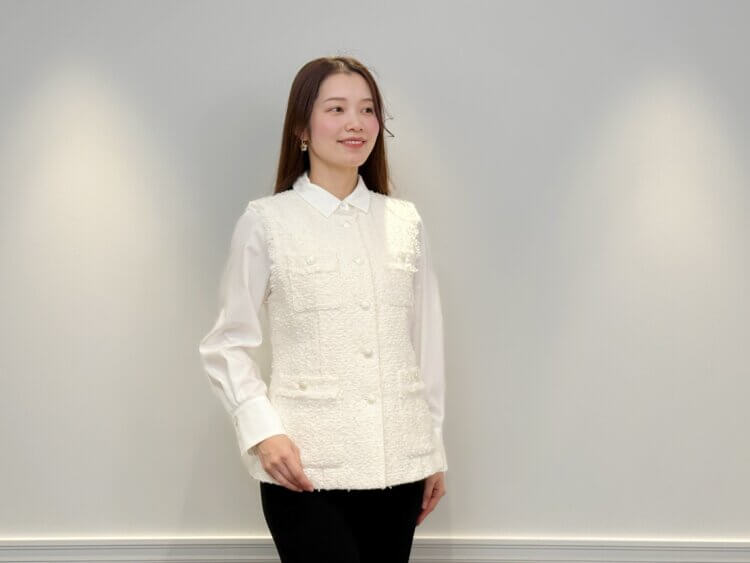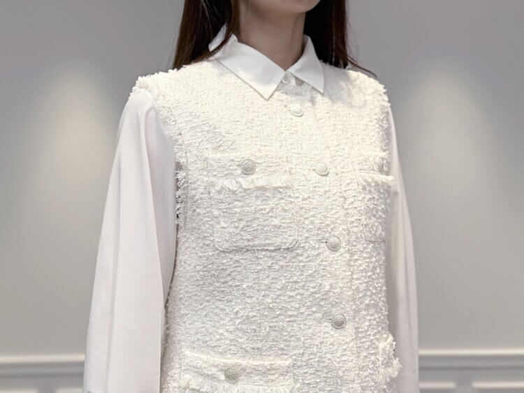 ホワイトの<フリンジツイードジレ>に同色のブラウスを重ね、ブラックのテーパードパンツで引き締めた、気品漂うスタイリングです。素材の表情と立体的なディテールが奥行きを生み、シンプルながらも存在感のある装いに。足元は黒のパンプスを合わせ、全体をすっきりとまとめました。通勤から会食まで対応できる、洗練された大人のためのバランスです。