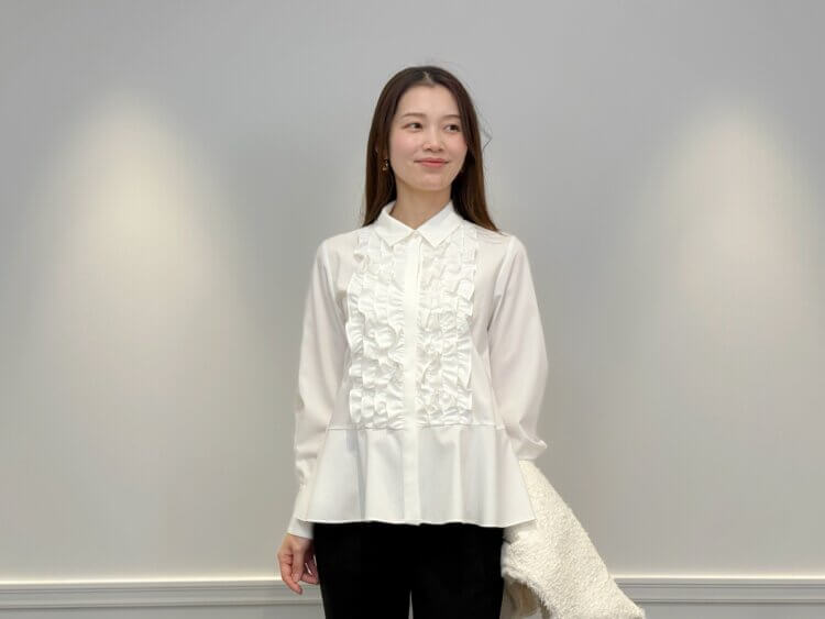 <フロントフリルペプラムブラウス>は、立体的なフリルが顔まわりに華やぎを添える一枚。ウエストから広がるペプラムシルエットが自然なメリハリを生み、ジレとのレイヤードでも美しいバランスを保ちます。ホワイトを重ねることでツイードの質感がより際立ち、柔らかさと端正さを両立した印象に導きます。