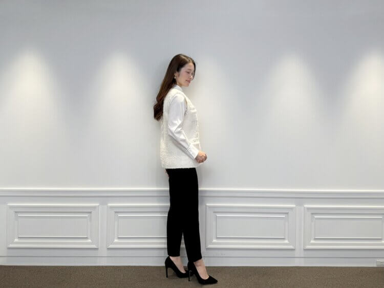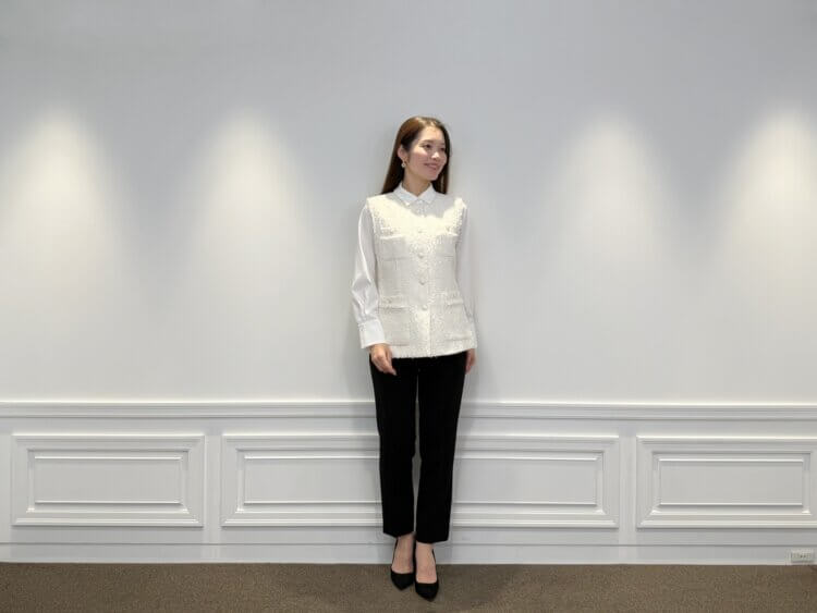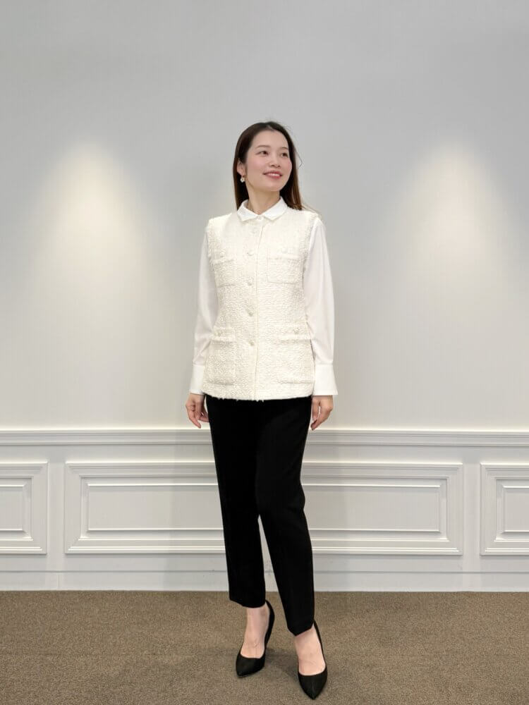 ツイードジレで完成する、知性と品格を纏うホワイト×ブラックの洗練スタイル