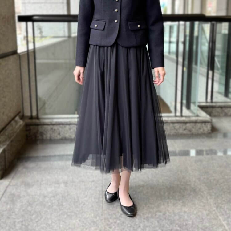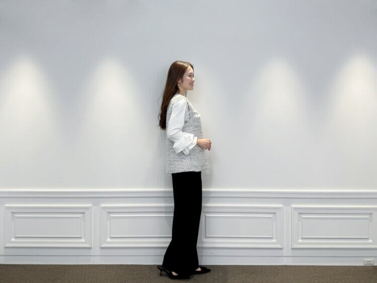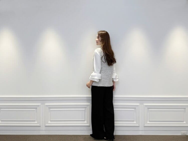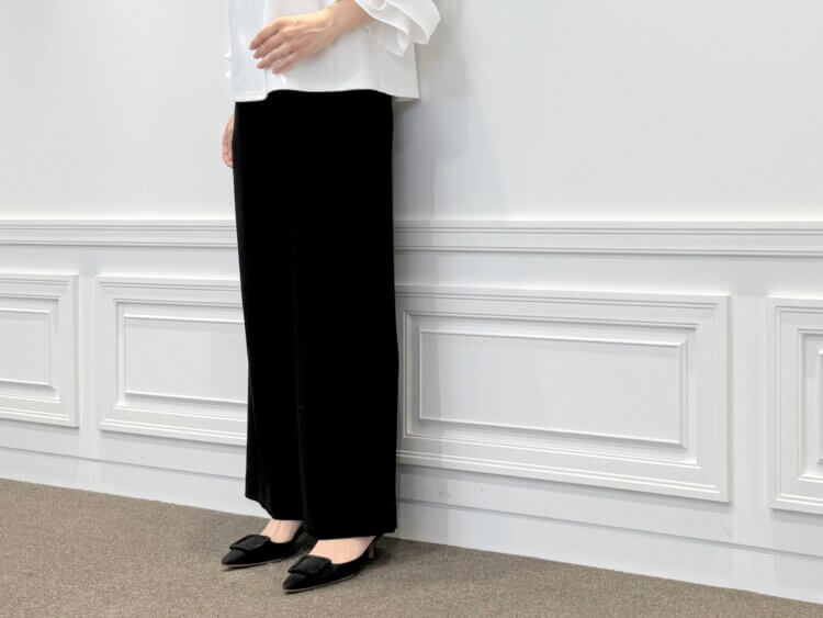 ボトムにはブラックの<ソアパールコンパクトプルオンワイドパンツ>を合わせ、全体を引き締めました。落ち感のある素材とワイドシルエットが優雅な動きを生み、ジレの縦ラインと調和してスタイルを美しく演出します。ウエストはプルオン仕様でありながら、きちんと感を損なわない洗練されたデザイン。ブラックのパンプスを合わせることで、足元まで一貫した品格を宿したモノトーンコーディネートが完成します。