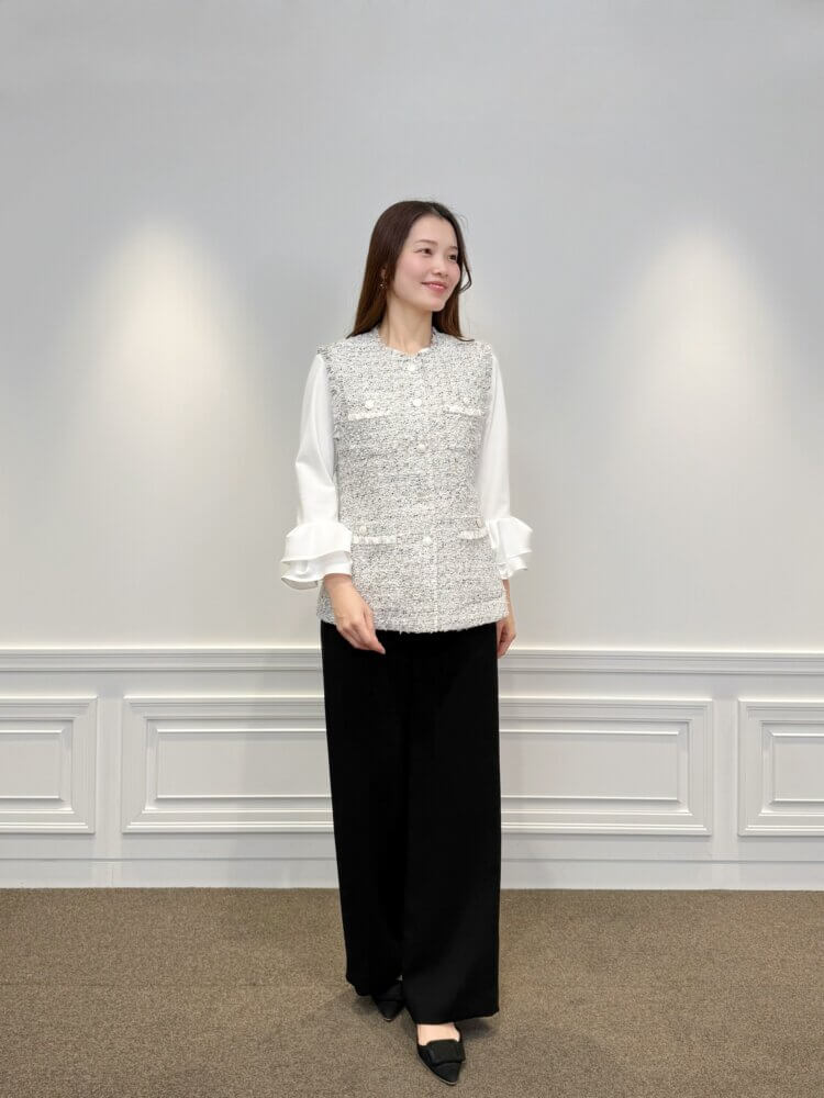 クラシカルな<フリンジツイードジレ>レに、端正なホワイトカットソーを重ね、ブラックのワイドパンツで引き締めた装い。グレー×ホワイト×ブラックの配色が都会的な印象をもたらし、落ち着きの中に確かな華やぎを感じさせます。縦のラインを意識したシルエット構成により、スタイルアップ効果も期待できるバランスに。足元もモノトーンで統一しを、全体を端正にまとめました。