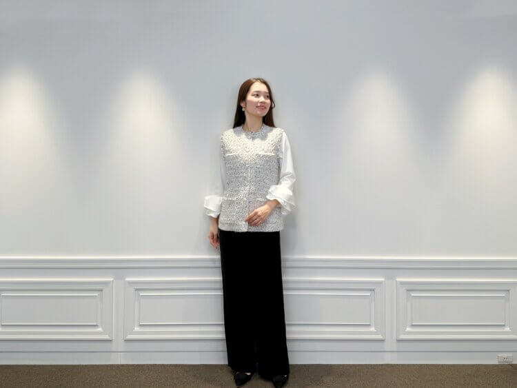 ツイードジレとカットソーのレイヤードで魅せる品格漂うモノトーンスタイル