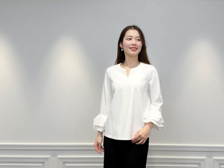 インナーには<ティアードカフスポンチカットソー>をセレクト。適度なハリと滑らかさを併せ持つポンチ素材が、ジレのツイードと美しいコントラストを描きます。手元にあしらわれたティアードカフスがさりげないアクセントとなり、シンプルでありながらも印象に残る佇まいに。