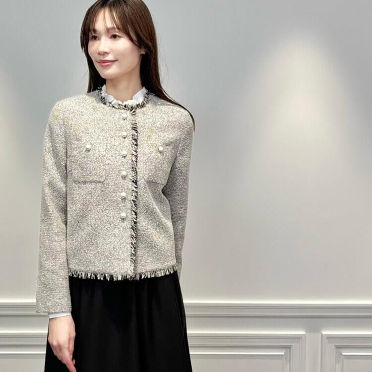 さらに表面にさりげなくあしらわれたフリンジデザインが柔らかなニュアンスを添え、モノトーンスタイルに豊かな表情をもたらします。裏地付き・ポケット付き・フロントボタン開き仕様で、実用性と品格を兼ね備えている点も魅力です。