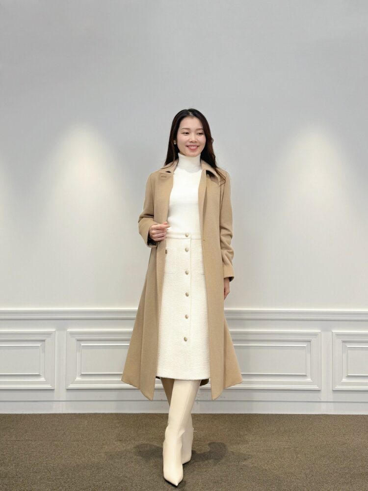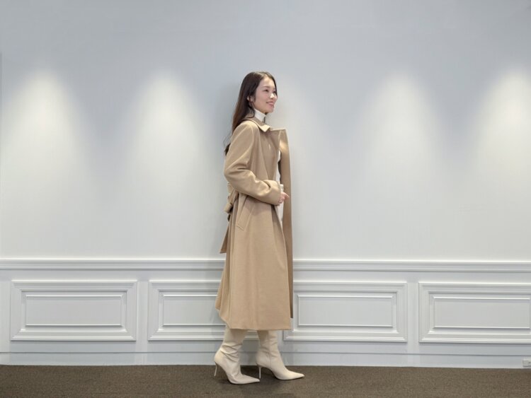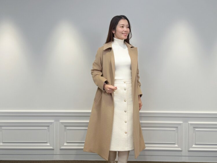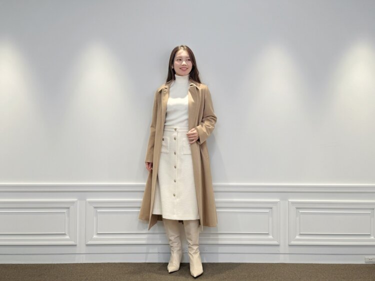 ホワイトを基調とした柔らかな配色に、キャメルのロングコートを重ねることで、温もりと洗練を兼ね備えた印象に仕上げました。異素材のコントラストが奥行きを生み、シンプルでありながら表情豊かなスタイリングを叶えます。足元にはホワイトのロングヒールブーツを合わせ、縦のラインを意識することで、全体をすらりとしたバランスに。大人の女性にふさわしい、落ち着きと華やぎを両立した冬の装いです。