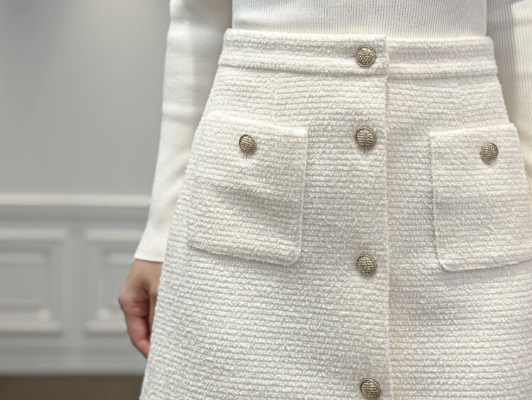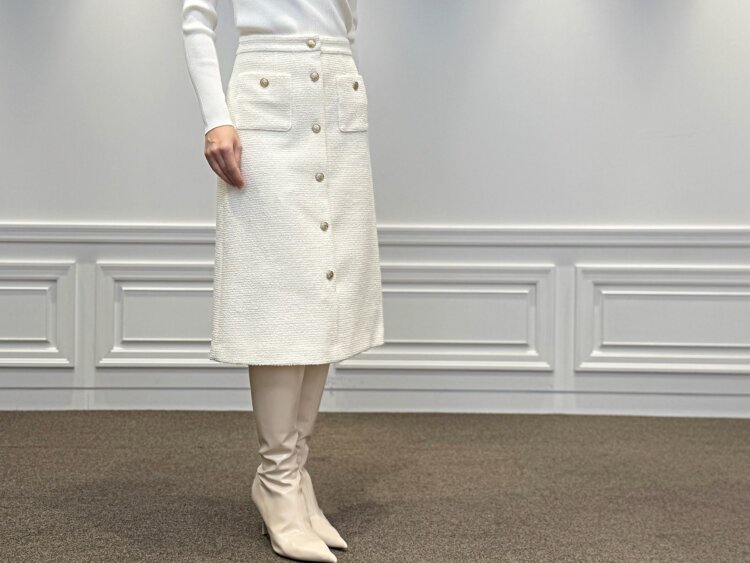 <ゴールドボタンニットツイードスカート>は、ニットならではの柔らかさとツイードの上質感を併せ持つ一枚です。立体感のある編み地が、ホワイトカラーでも間延びせず、スタイルに奥行きを与えてくれます。フロントにあしらわれたゴールドボタンが控えめなアクセントとなり、エレガントで洗練された印象を引き立てます。