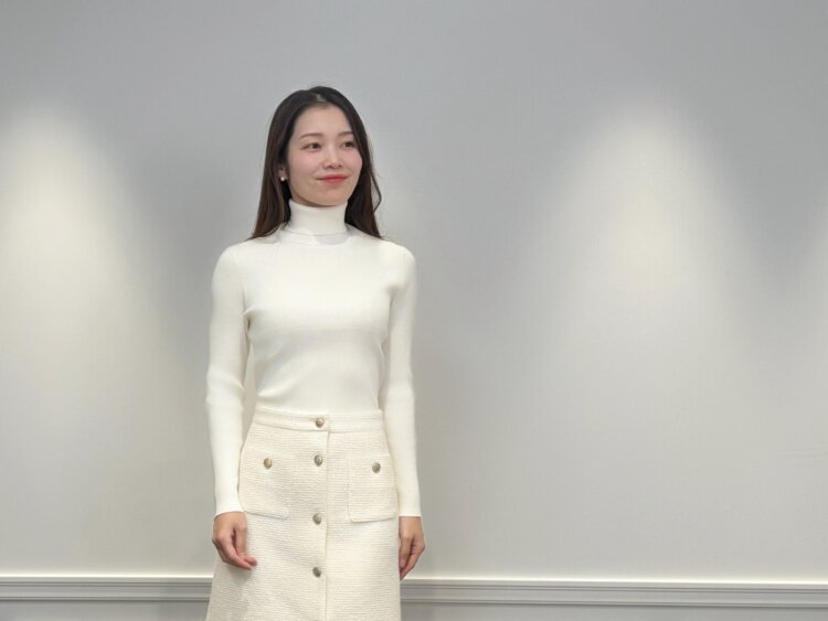 身体のラインに程よく沿うリブ編みが特徴で、スカートの存在感を引き立てる名脇役の<タートルネックリブニットプルオーバー>。ホワイトカラーが全体にクリーンな印象をもたらし、ツイードスカートとの統一感を高めます。首元まで包み込むタートルネックが、冬らしい上品さと安心感を添えてくれます。