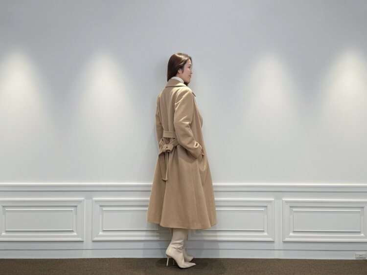 <ウールカシミヤベルテッドロングコート>は、上質な素材感が一目で伝わる大人のための一着。キャメルカラーの柔らかな発色が、ホワイトトーンのスタイリングに温もりをプラスします。共布ベルトでウエストマークすることで、スカートスタイルでも重たくならず、全体をバランス良くまとめてくれます。
