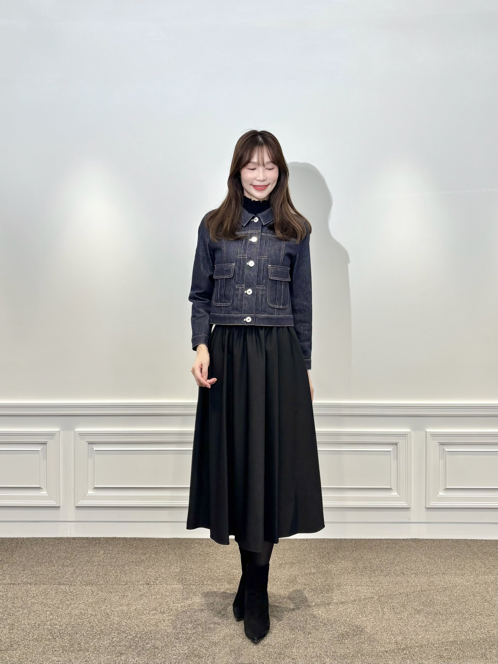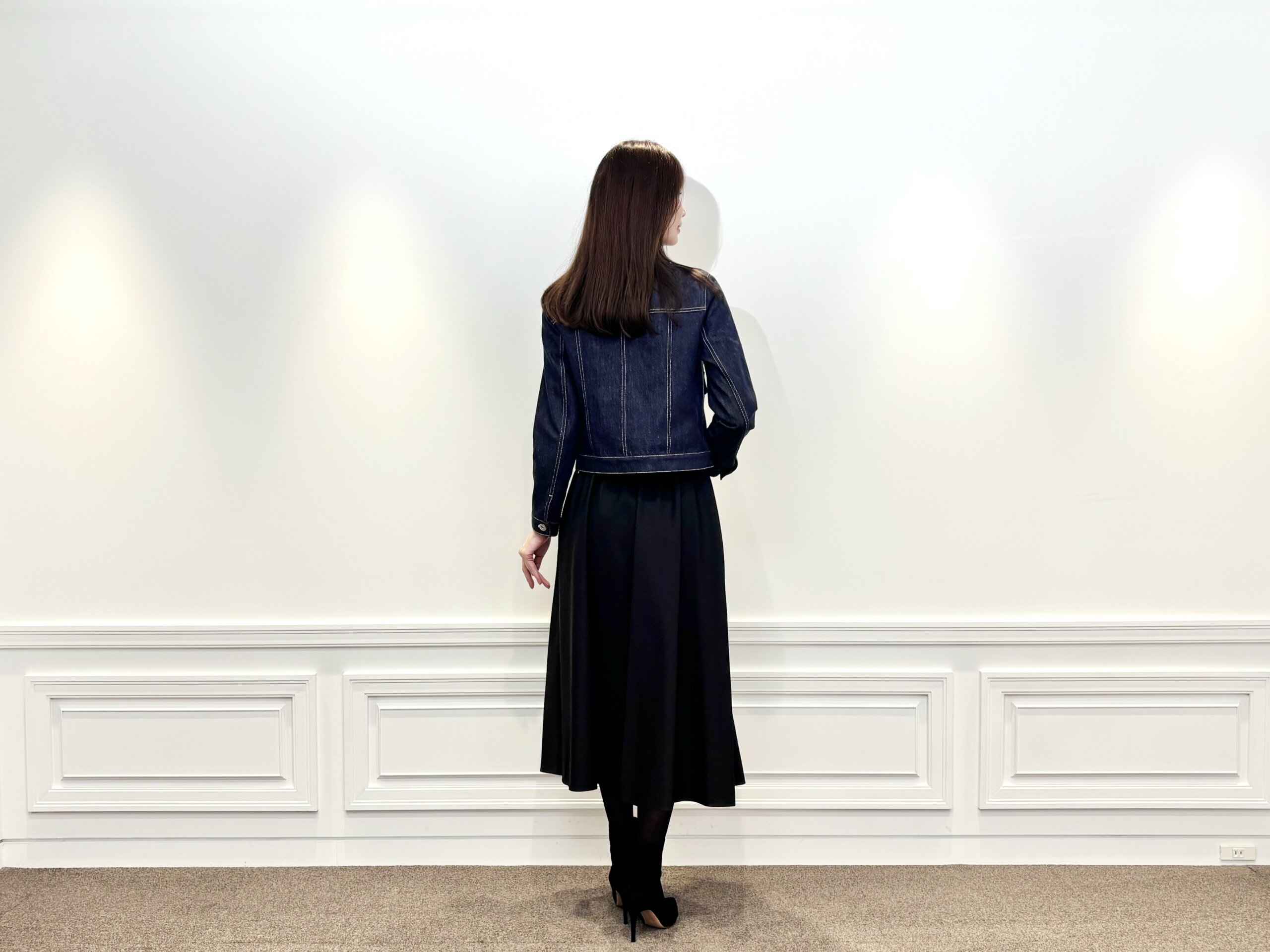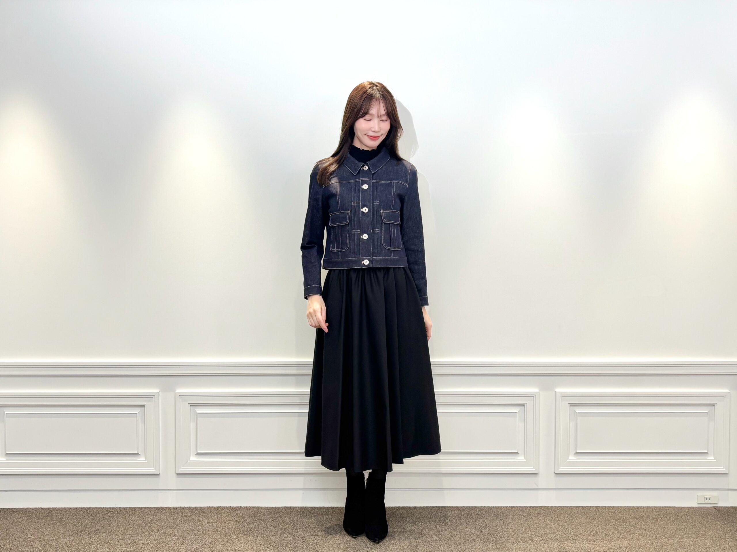 今回のコーデでは、ハリのある濃紺デニムにステッチやフラップポケットのディテールが立体感を添えるジャケットを主役に。コンパクトな丈感が全体をすっきり見せ、ボリュームのあるスカートとのバランスも絶妙です。