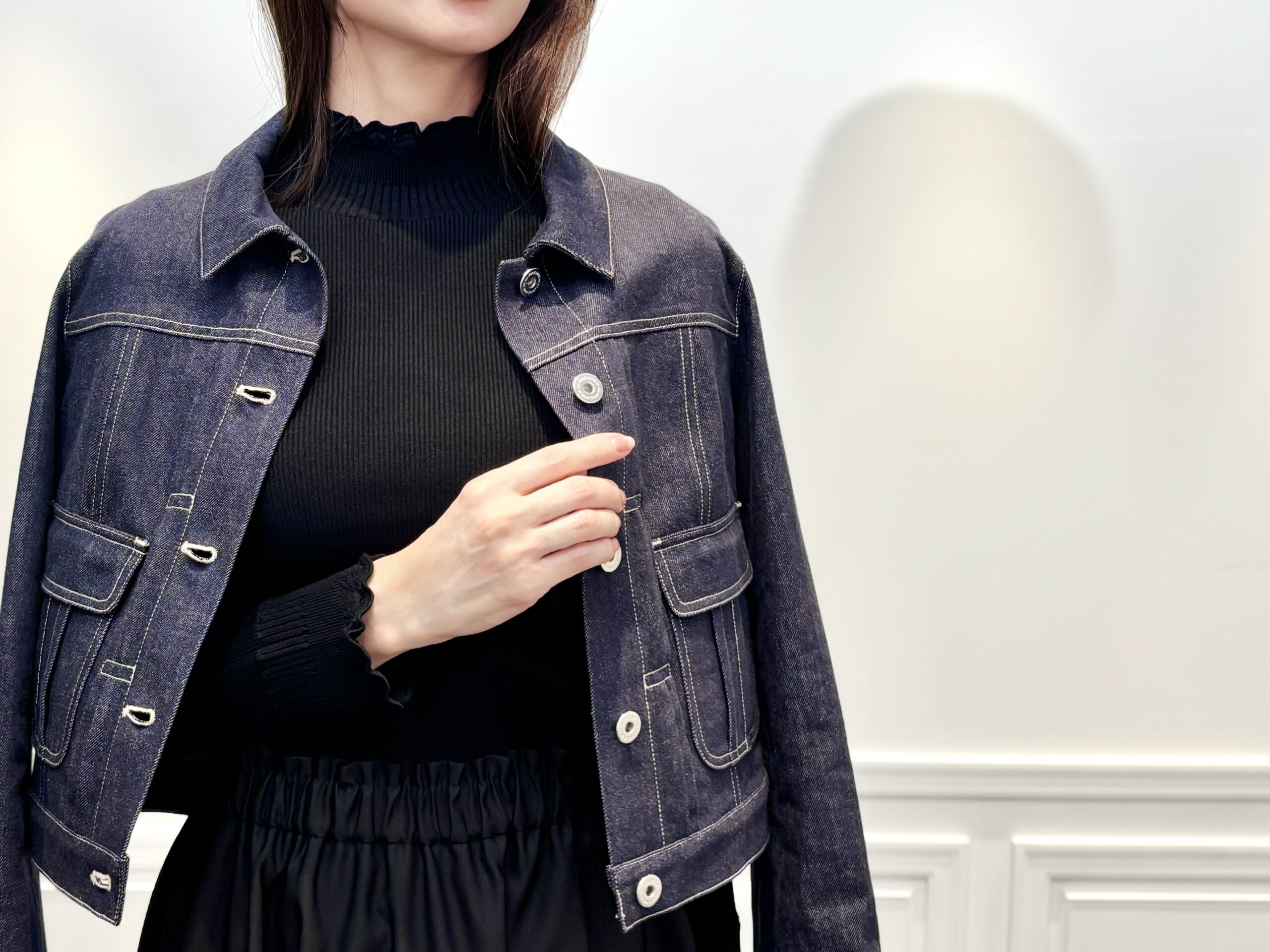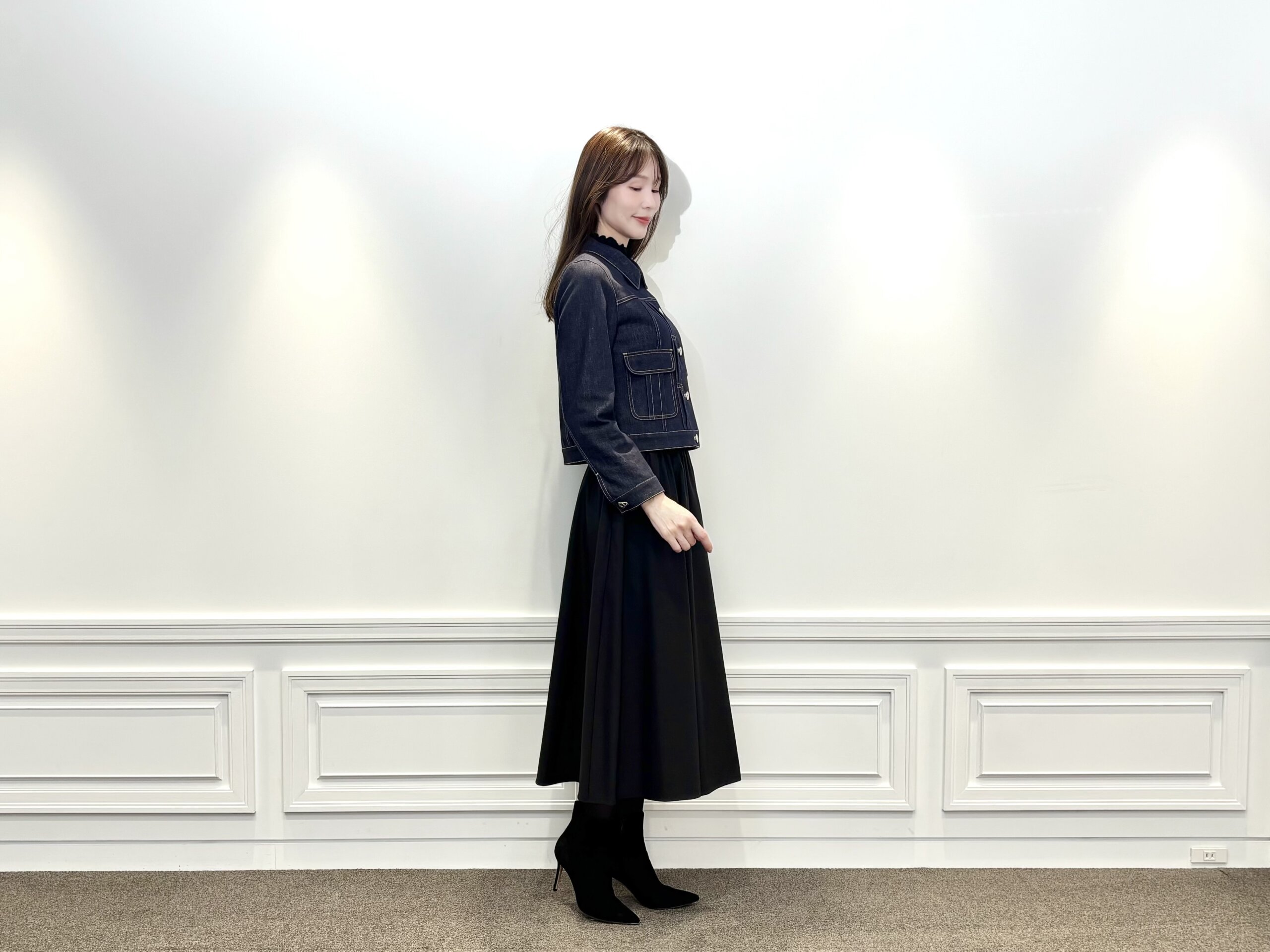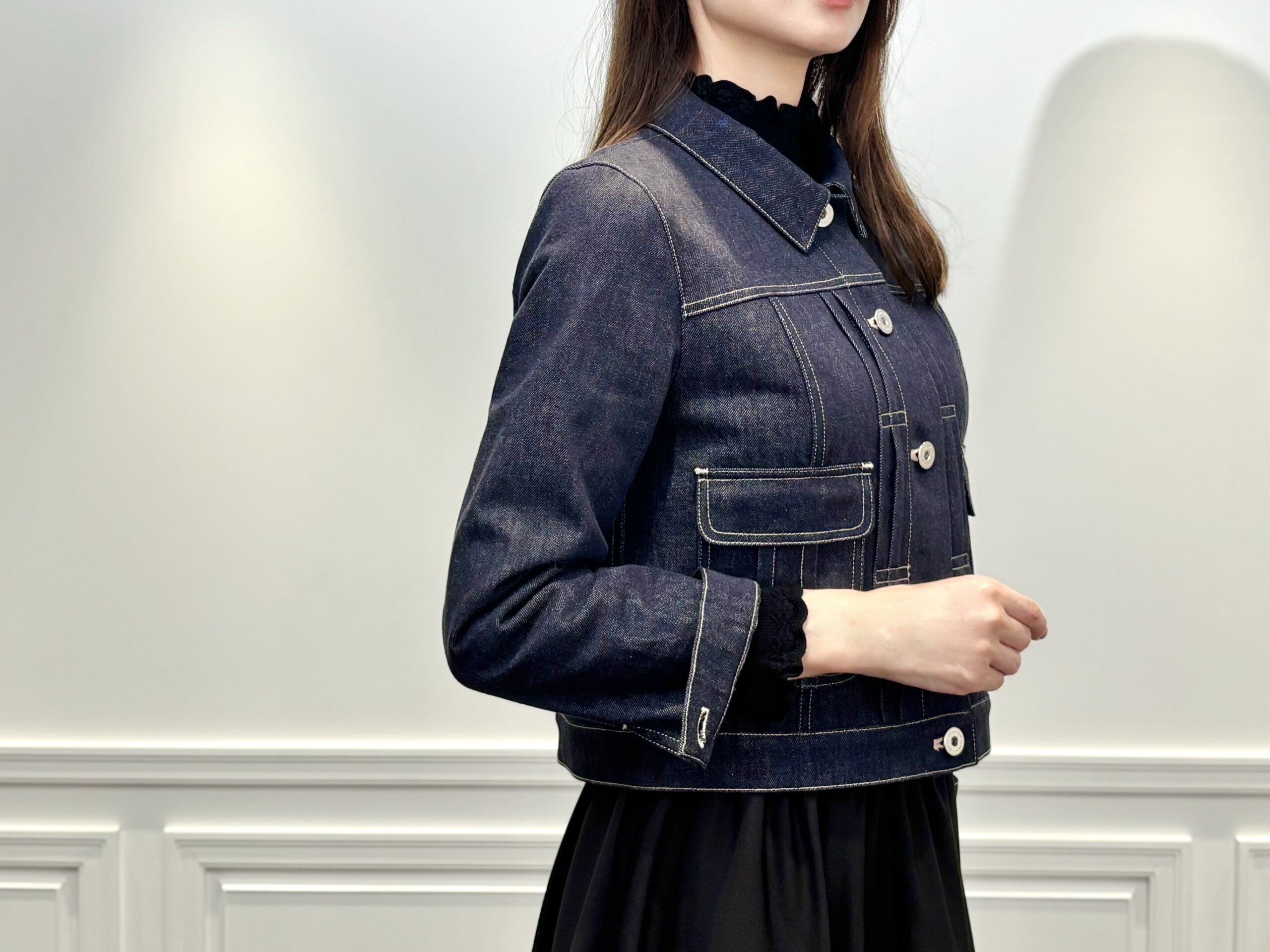 今回のコーデでは、ハリのある濃紺デニムにステッチやフラップポケットのディテールが立体感を添えるジャケットを主役に。コンパクトな丈感が全体をすっきり見せ、ボリュームのあるスカートとのバランスも絶妙です。