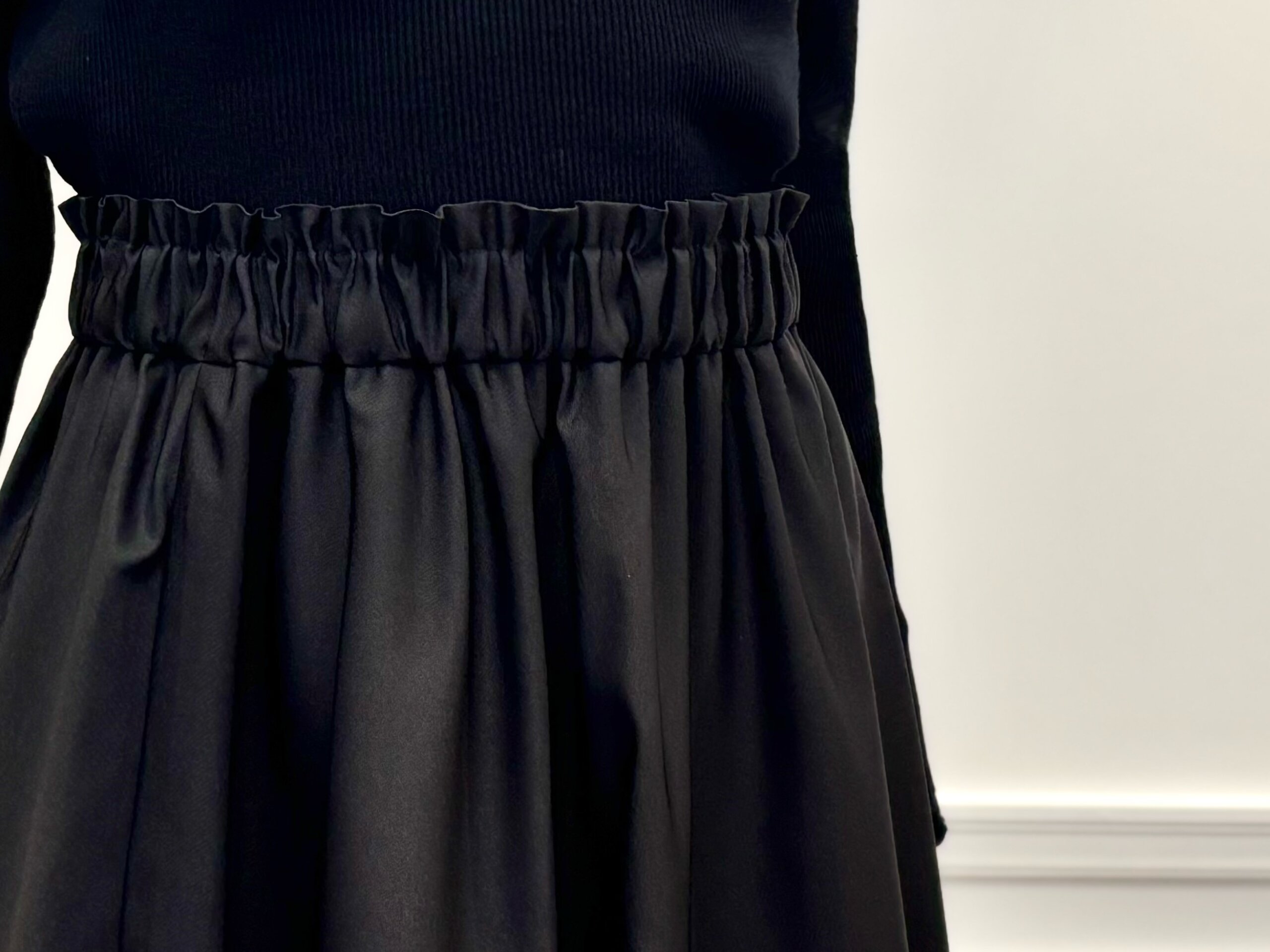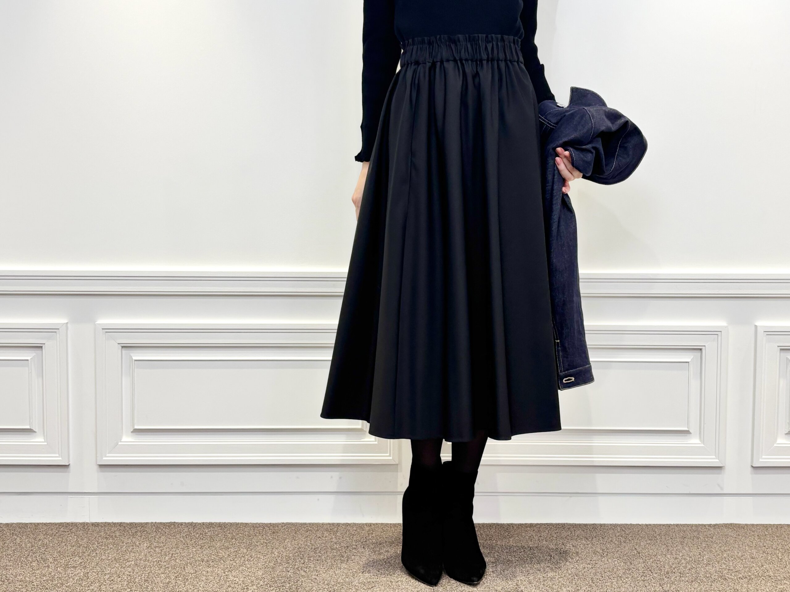 上品な光沢とほどよいハリ感がエレガントな印象を与える一枚です。美しく広がるフレアシルエットが女性らしさを引き立て、膝下までしっかりとある丈感で上品にお召しいただけます。