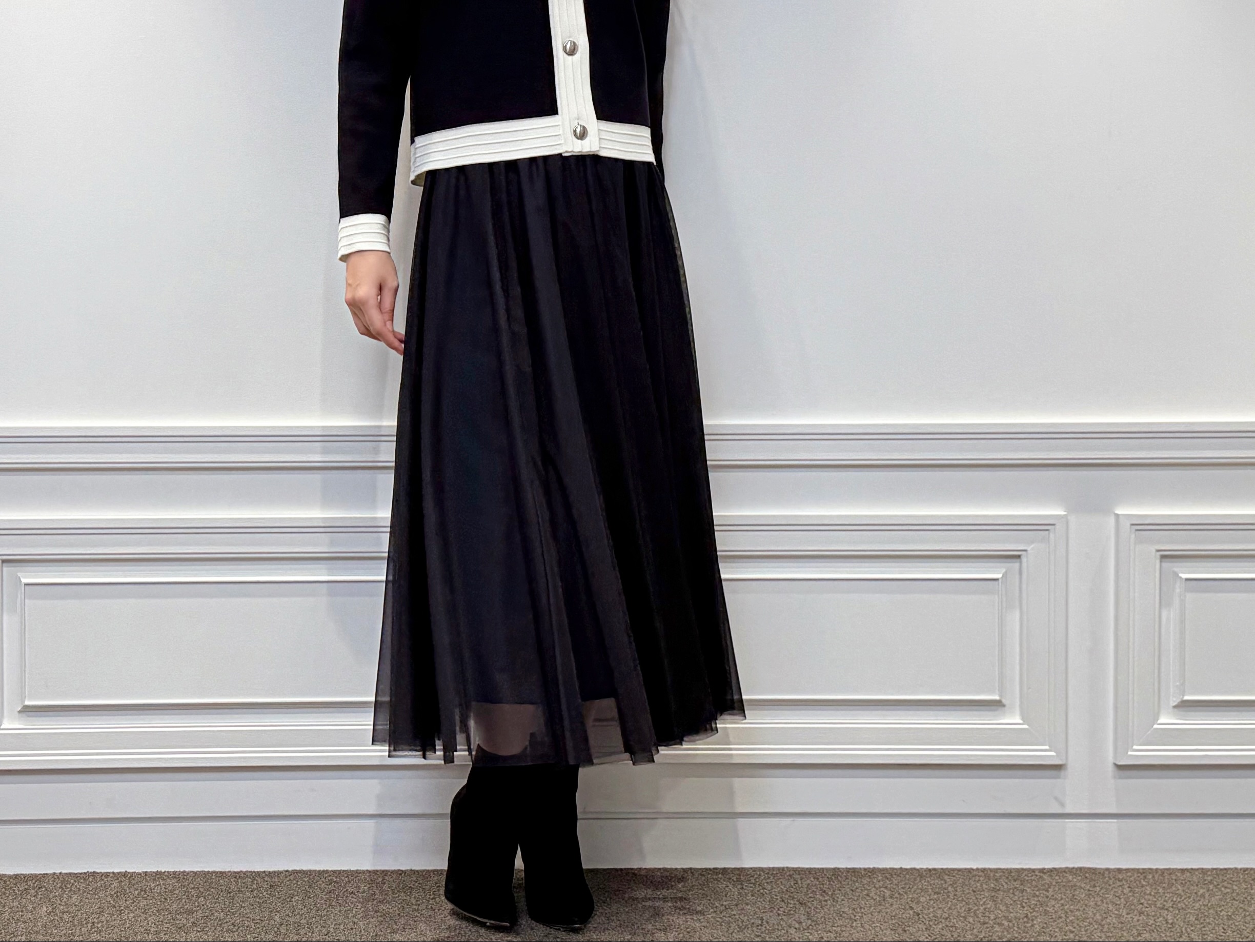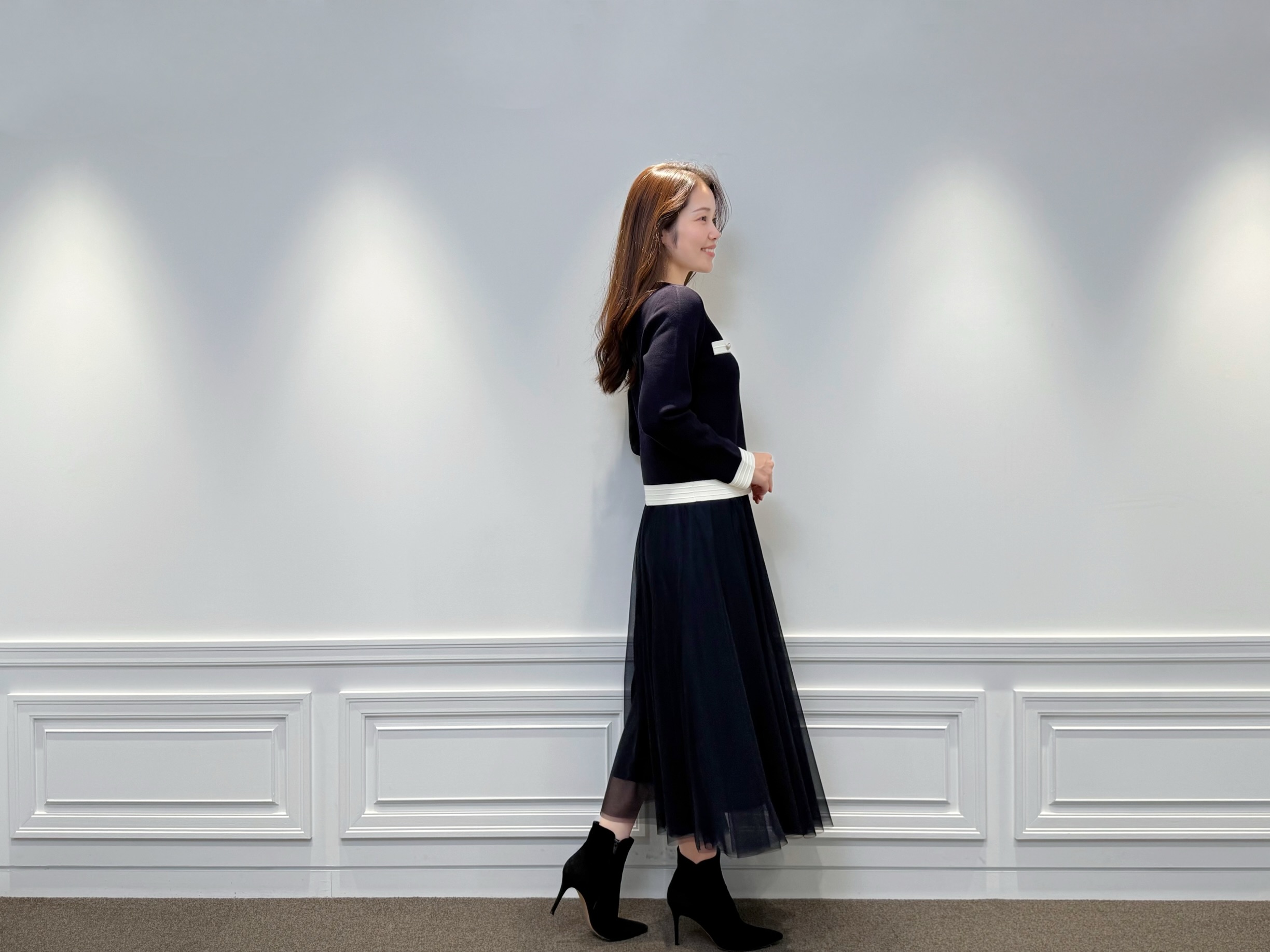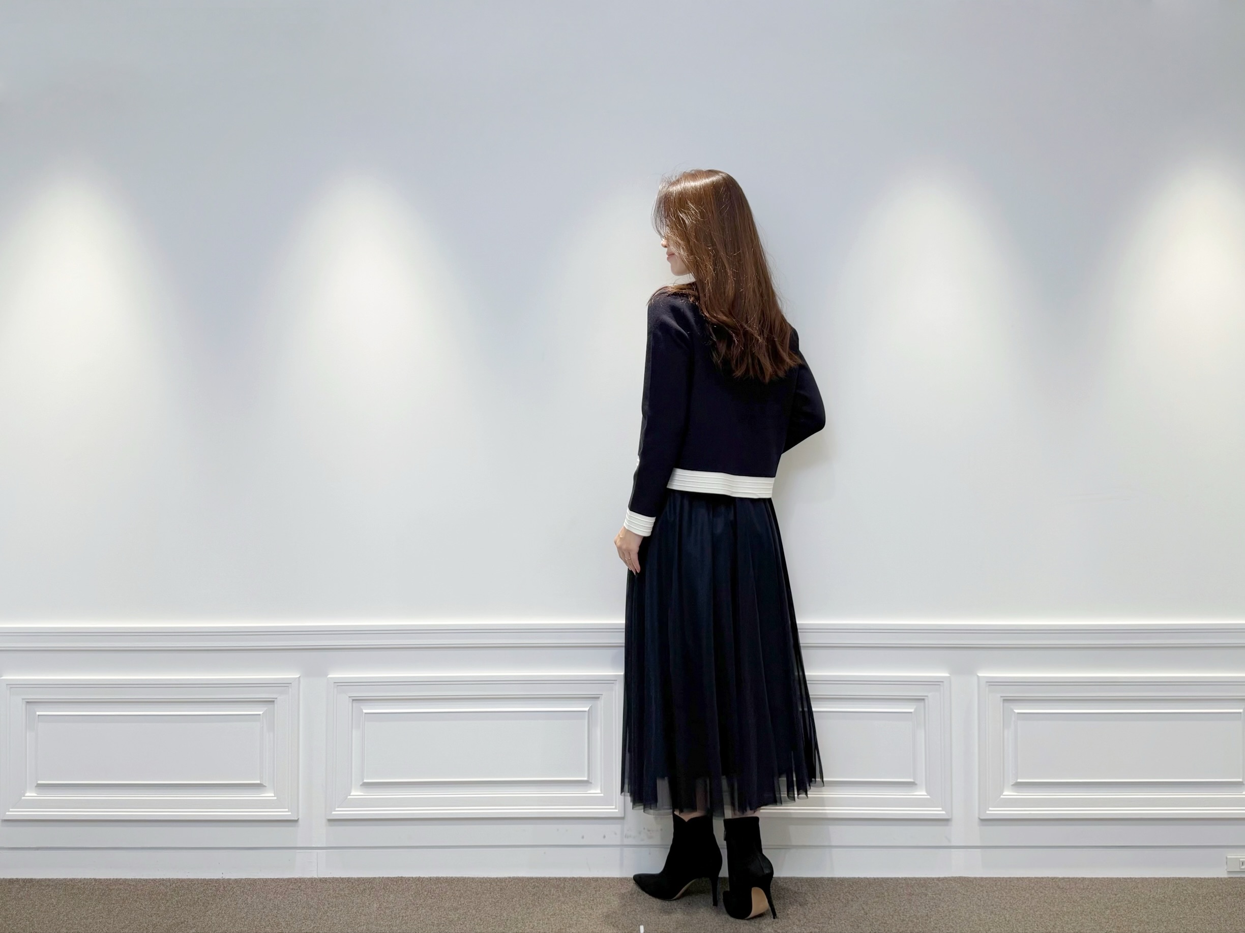 バイカラーニットジャケットのきちんと感と、チュールスカートの柔らかい質感を組み合わせることで、知的さと女性らしさを両立させました。