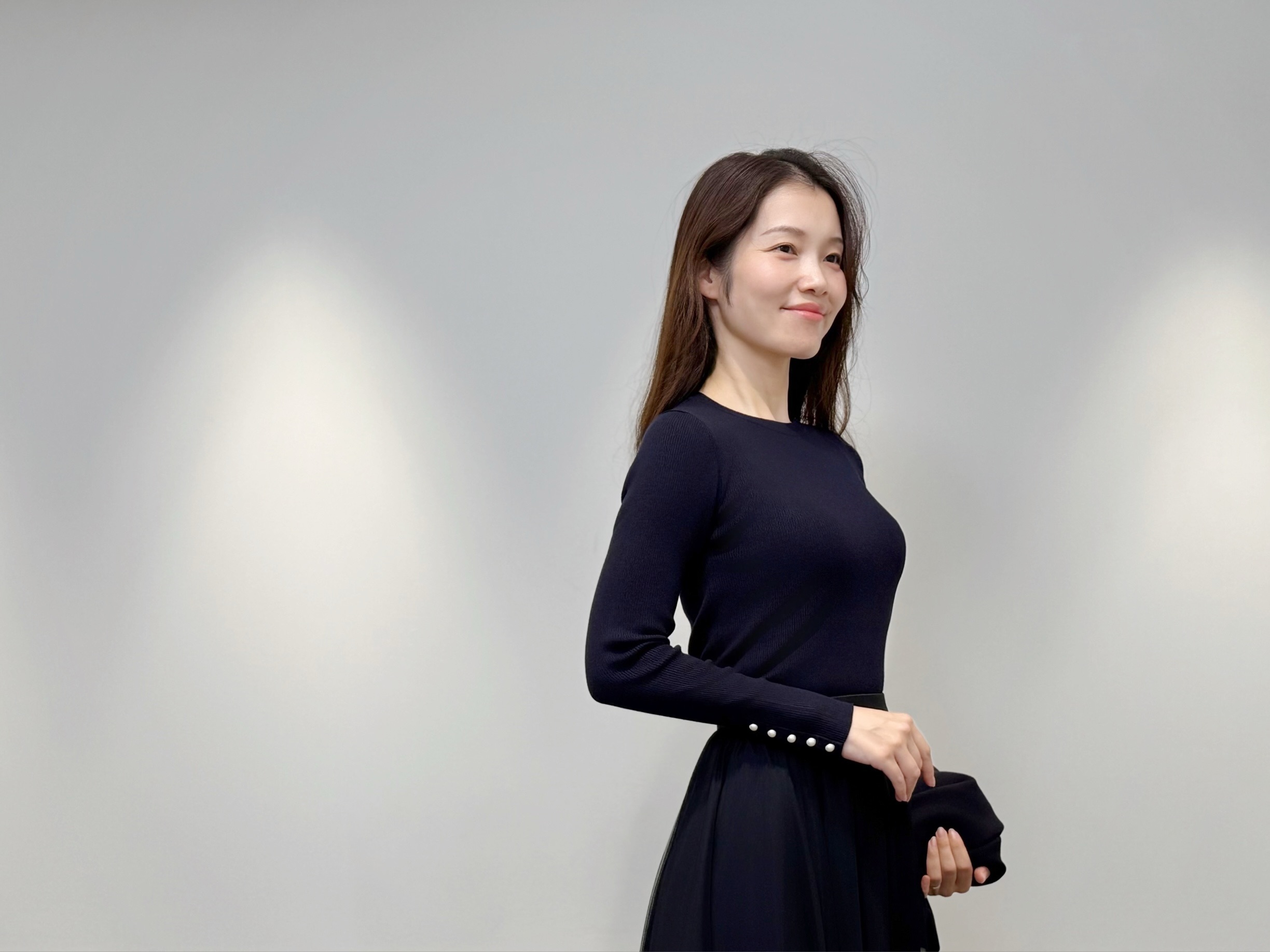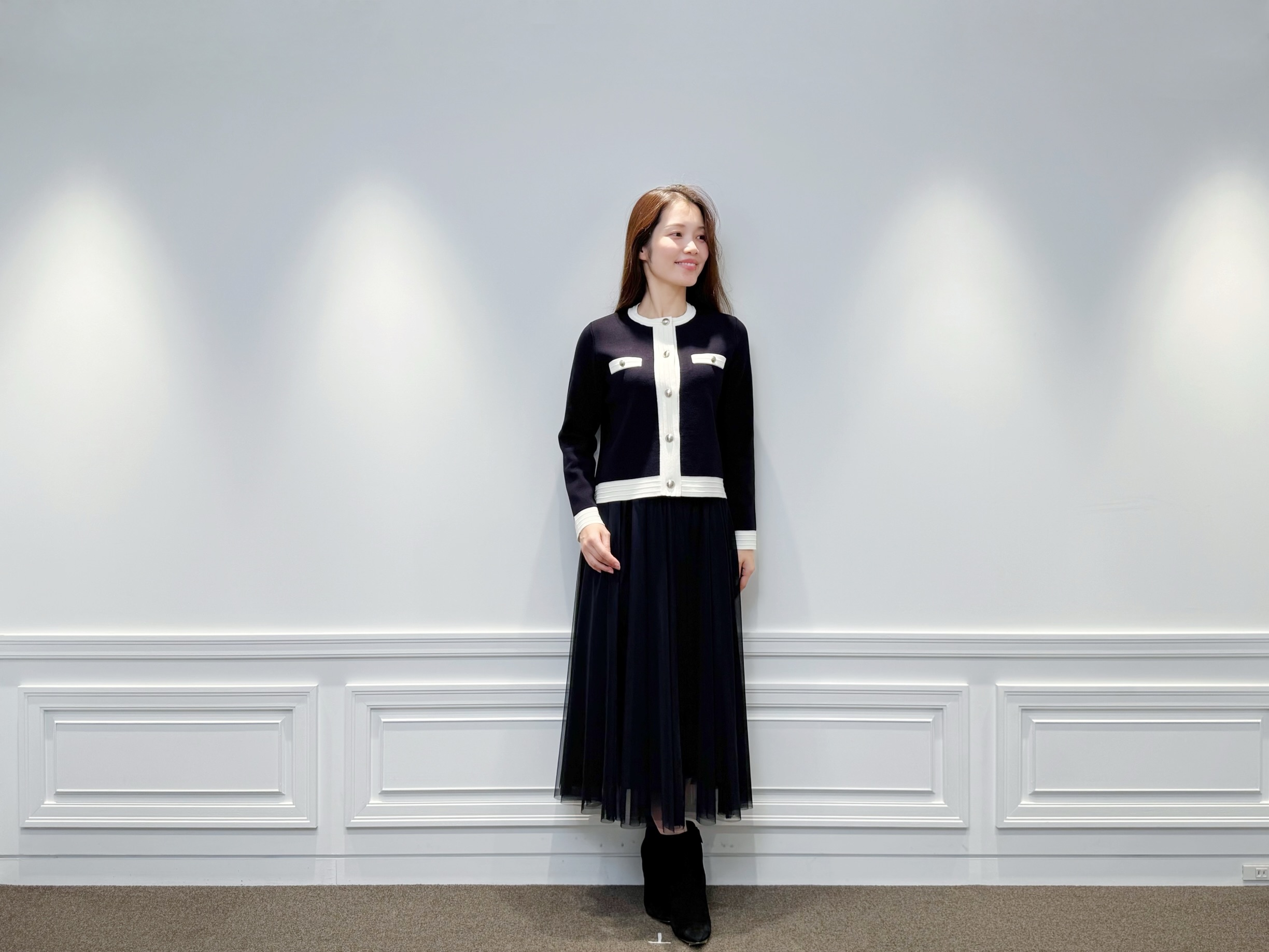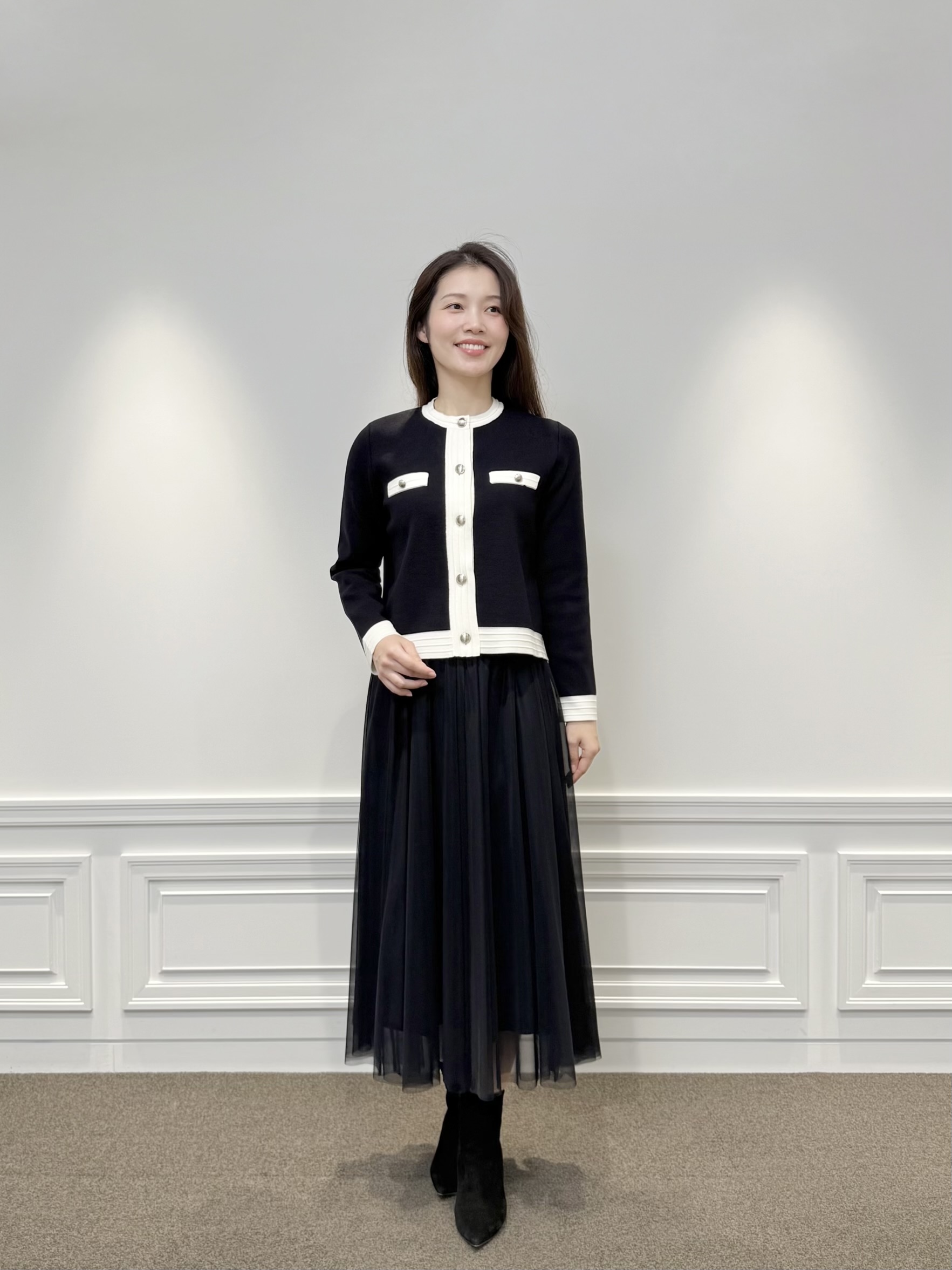 バイカラーニットジャケットのきちんと感と、チュールスカートの柔らかい質感を組み合わせることで、知的さと女性らしさを両立させました。
