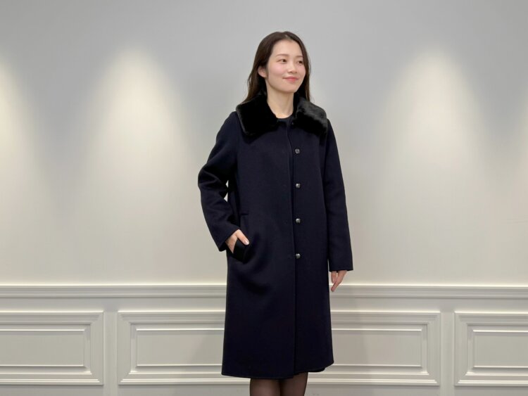 <ファーカラーロングコート>は、上質なラムリバー素材によるなめらかな表面感が、装い全体をエレガントに格上げ。フェイクファーの襟が顔まわりに柔らかな華やぎを添え、ネイビーのワントーンスタイルに奥行きをもたらします。ファーは取り外し可能なため、すっきりとした印象にもアレンジでき、シーンに応じた着こなしが可能です。