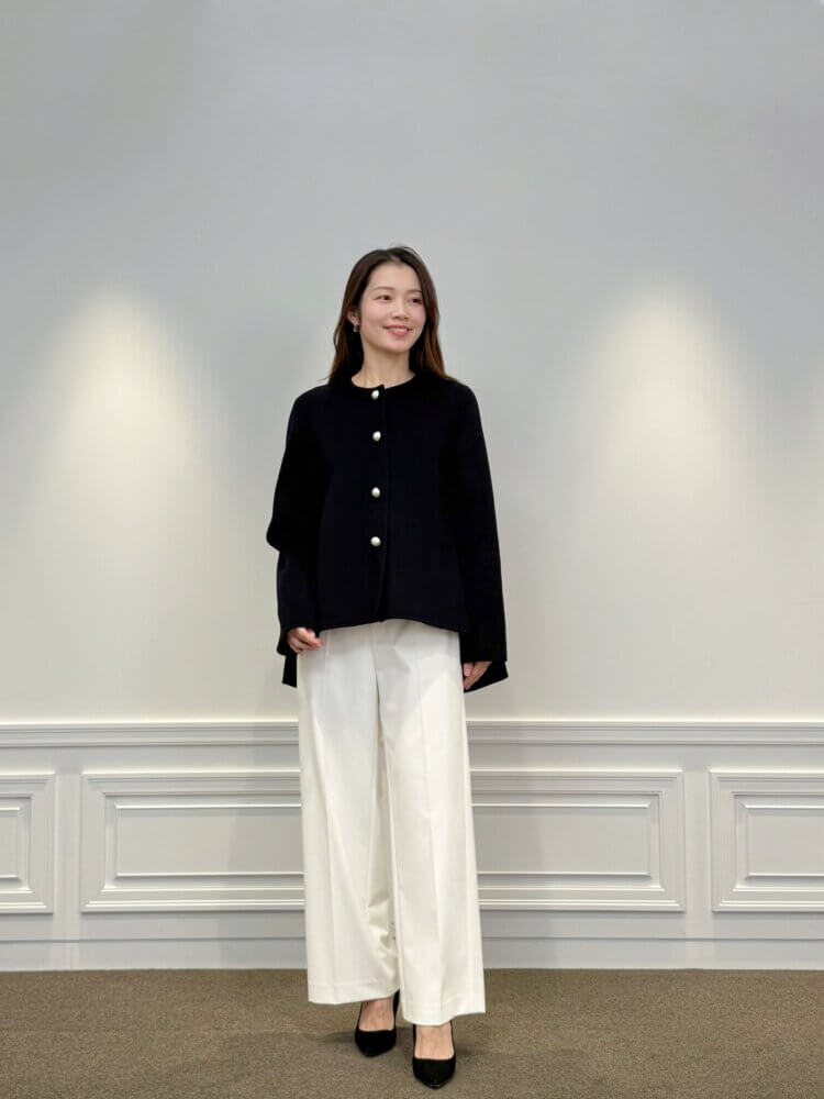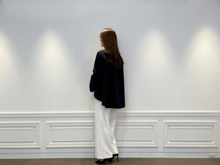 濃紺の柔らかい深みと、ホワイトのクリーンな抜け感が調和し、シンプルながら立体感のある冬スタイルに仕上がっています。ショートコートの軽やかさが上半身をすっきりと見せ、ワイドパンツの落ち感と相まって、全身に美しい縦ラインを形成。ネイビーのワントーンにホワイトを差し込むことで、冬の装いに透明感が宿るバランスの良いスタイリングです。