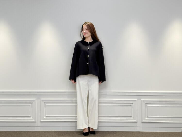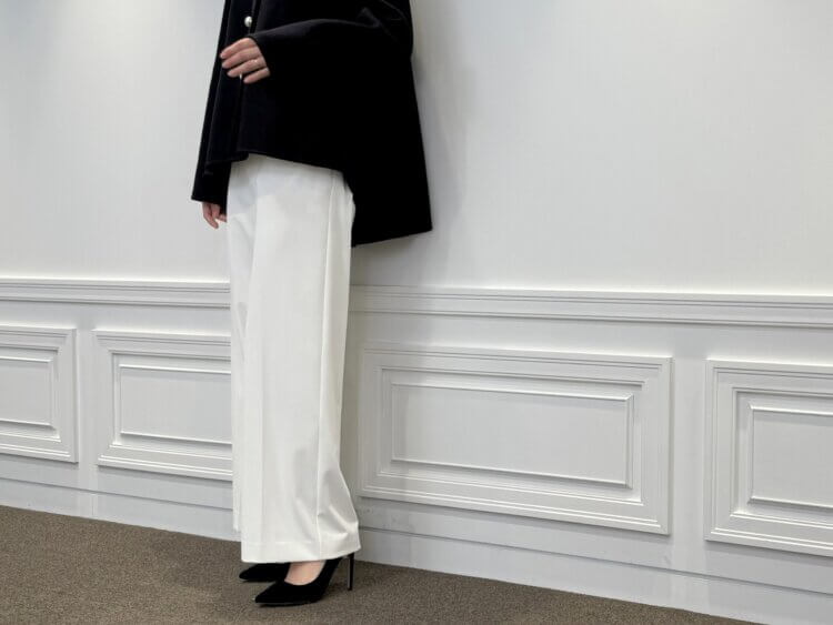 ボトムには、<センタープレスストレートワイドパンツ>を選び、スタイルアップ効果の高い一本が着こなしに明るさと洗練をプラスします。ストレートに落ちる美しいシルエットが脚のラインをまっすぐに整え、冬の重たさを感じさせない軽やかなムードを演出。ネイビーのトップスを受け止めるホワイトが、品のあるメリハリを生み出してくれます。
