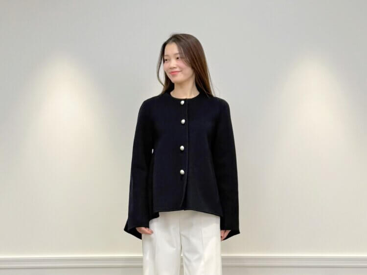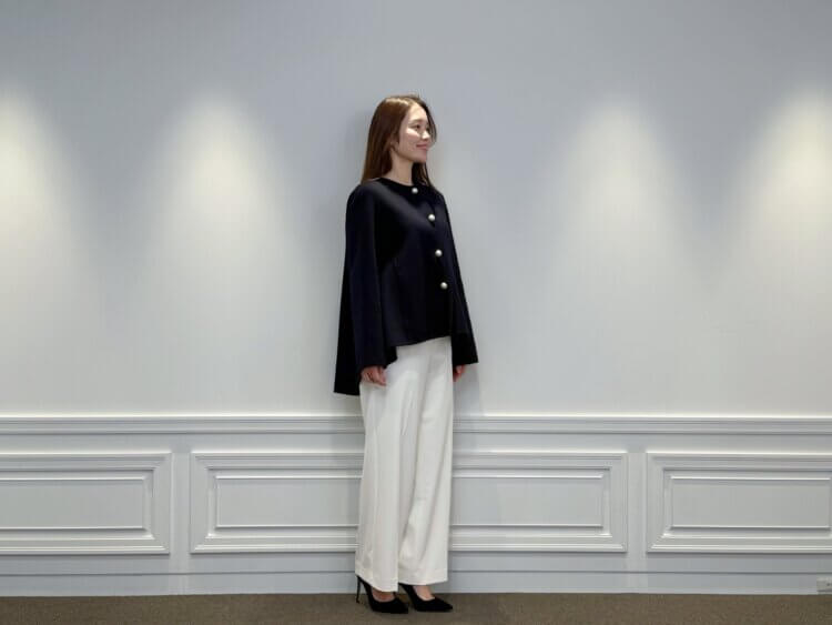 今回はラムウールのショートコートを主役にした、気品漂うネイビー×ホワイトのコーディネートをご紹介します!
