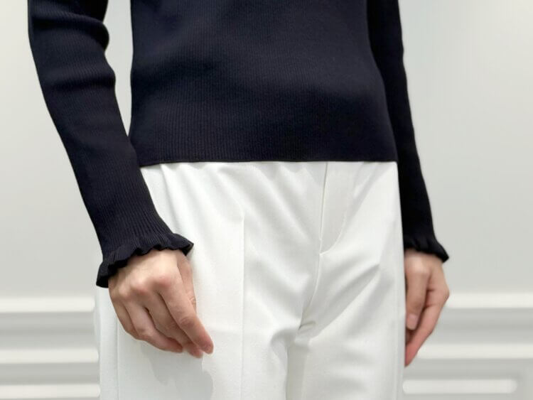 インナーには、<フリルスリーブリブニットプルオーバー>を合わせ、袖口に寄せたさりげないフリルがエレガントなアクセントに。リブ編みのフィット感が身体のラインを美しく見せ、ショートコートとの相性も抜群。シンプルながら女性らしいディテールを効かせた一枚が、全体のネイビートーンに奥行きを与えています。