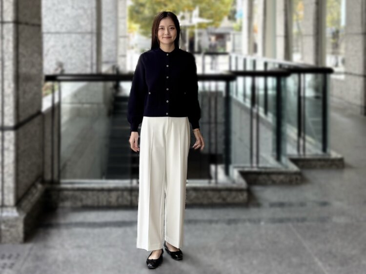 軽やかなホワイトパンツにネイビーを合わせるだけで、冬のシンプルコーデが一気に洗練。
