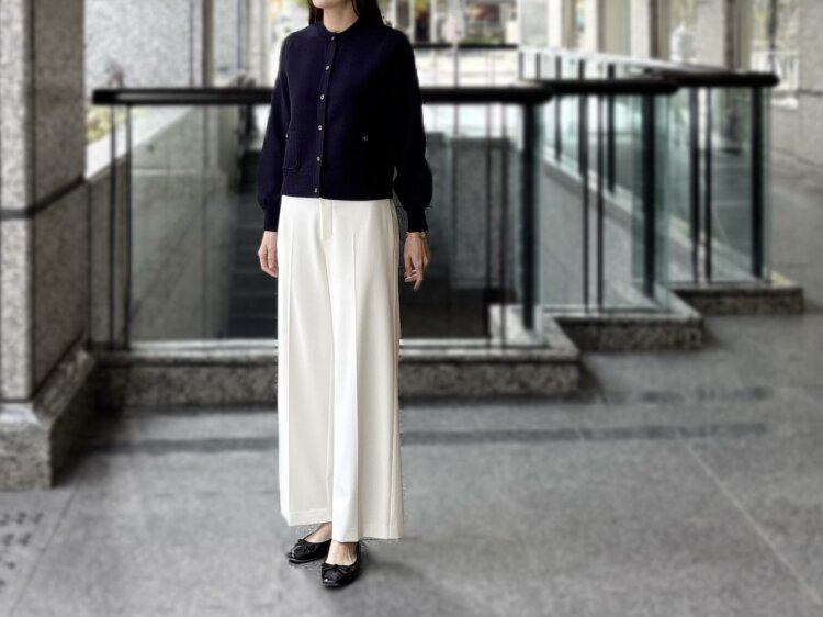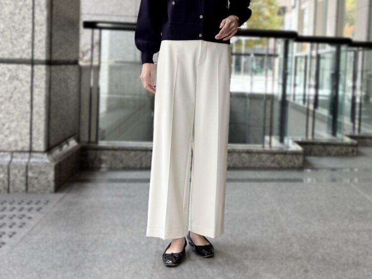 ホワイトのワイドパンツはとにかく脚がきれいに見え、センタープレスが縦ラインを強調してくれてゆったりシルエットでも上品な印象に。