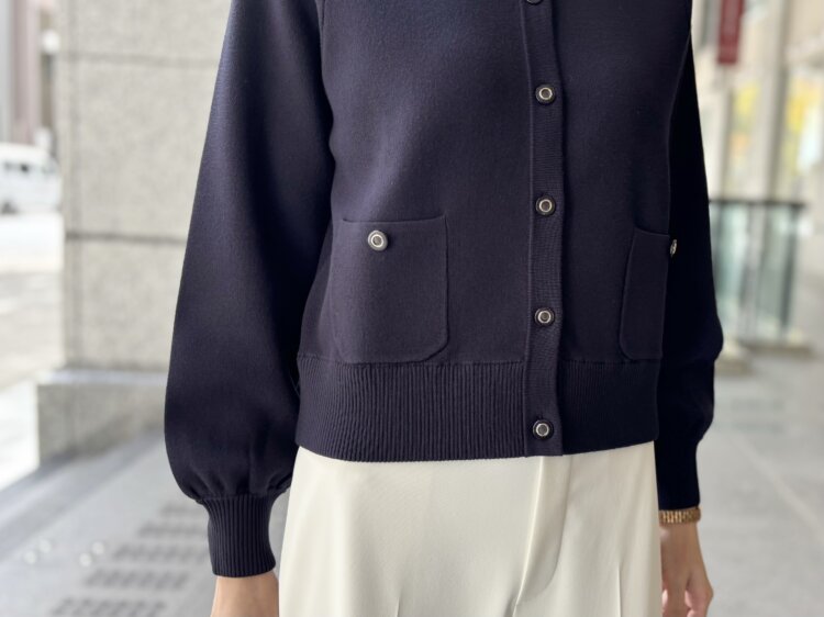 ネイビーのカーディガンは、薄手でもほどよい肉厚感で長い季節使える万能タイプ。
