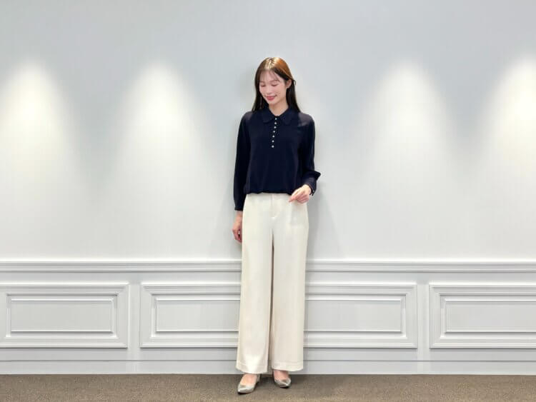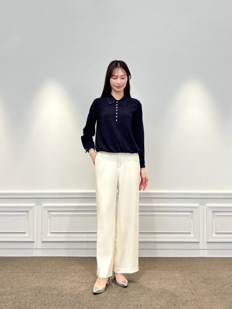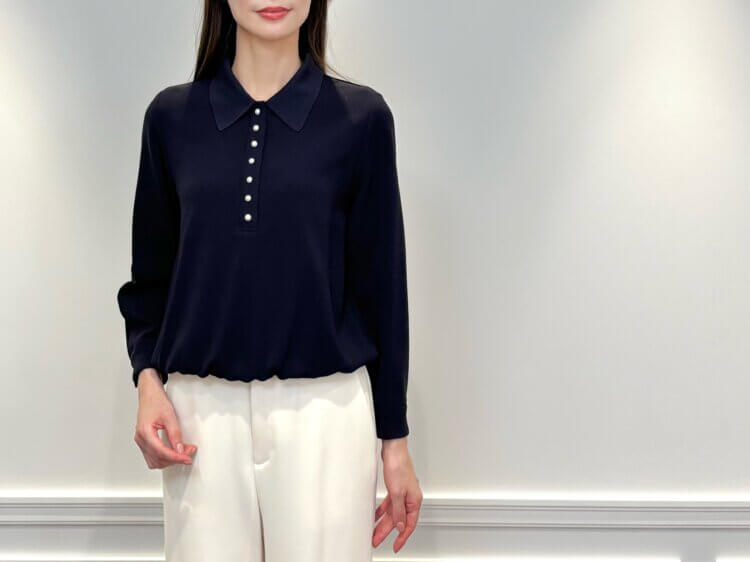 トップスは、デイリーに取り入れやすいポロデザインのネイビーブラウス。きちんと感のある襟元に、フロントのパールボタンがさりげない華やぎを添え、シンプルながらも女性らしい印象に仕上がります。ブラウス素材ならではの落ち感があり、カジュアルになりすぎず、お仕事や学校行事、きれいめなお出かけにも活躍する一枚です。