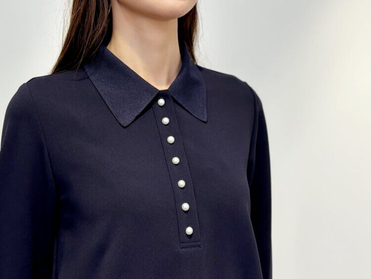ベーシックなポロデザインにパールボタンが並ぶことで女性らしい華やかさがプラスされたエレガントな一枚。