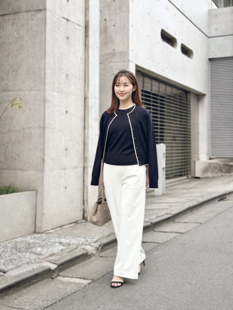 本日は、ドット編みのニットアンサンブルとホワイトのワイドパンツを合わせた、きれいめコーディネートをご紹介いたします。