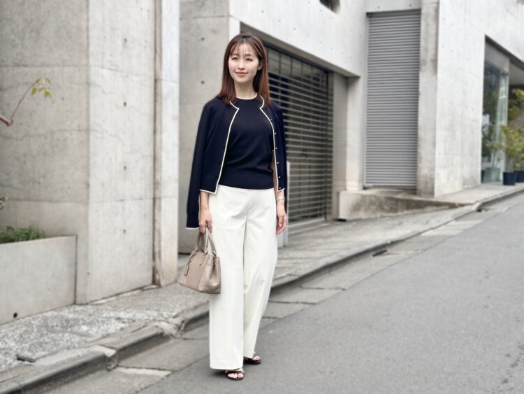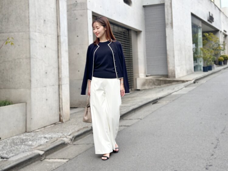 ネイビー×白で品よく整う、ニット×ワイドパンツのきれいめ通勤コーデ