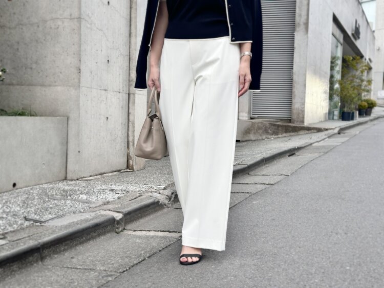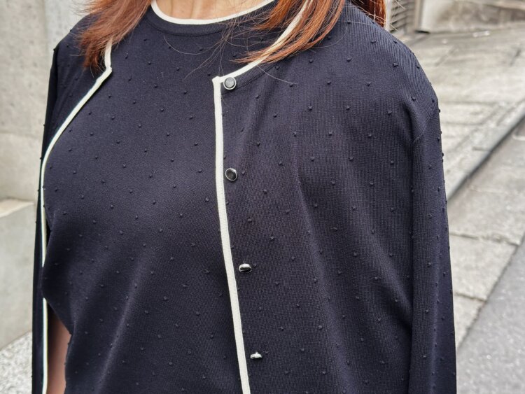 さらりとした肌あたりで着心地が良く、アンサンブルでも重たさを感じにくいのが印象的でした。ネイビー×ホワイトの配色も相まって、見た目はきちんと感がありながら、どこか軽やかに着られる一着です。