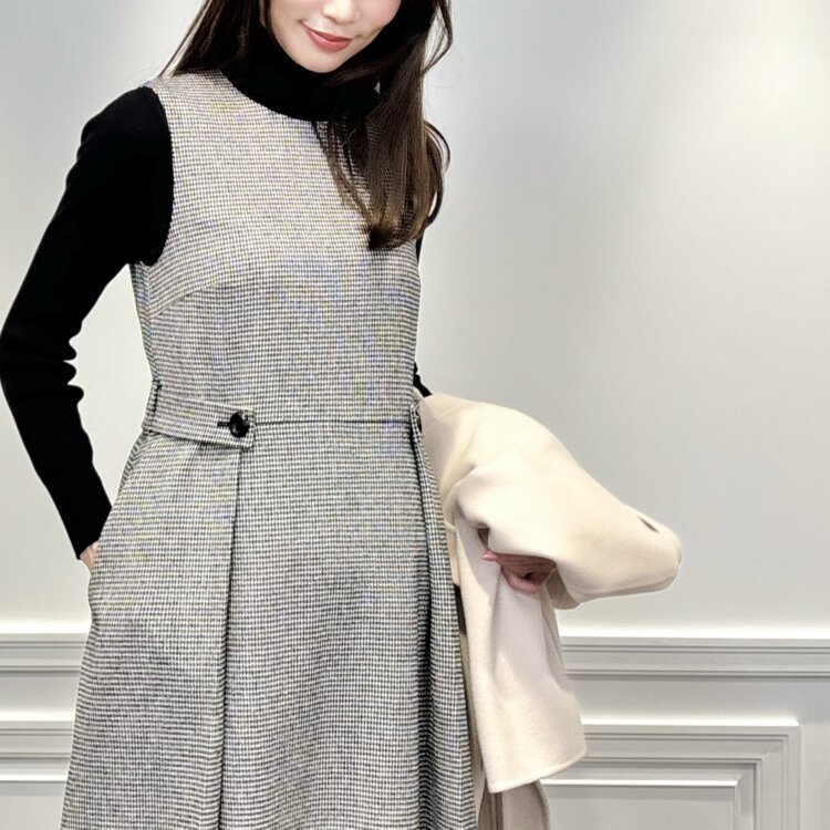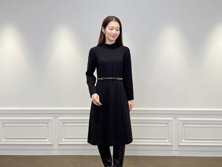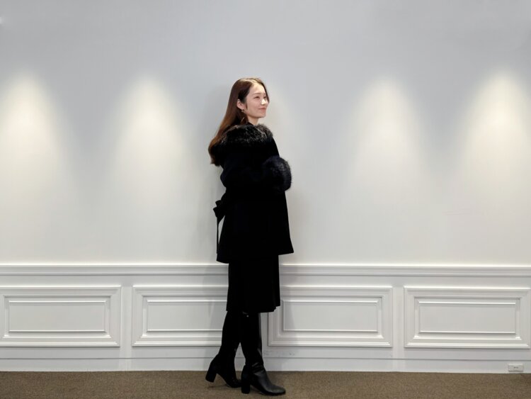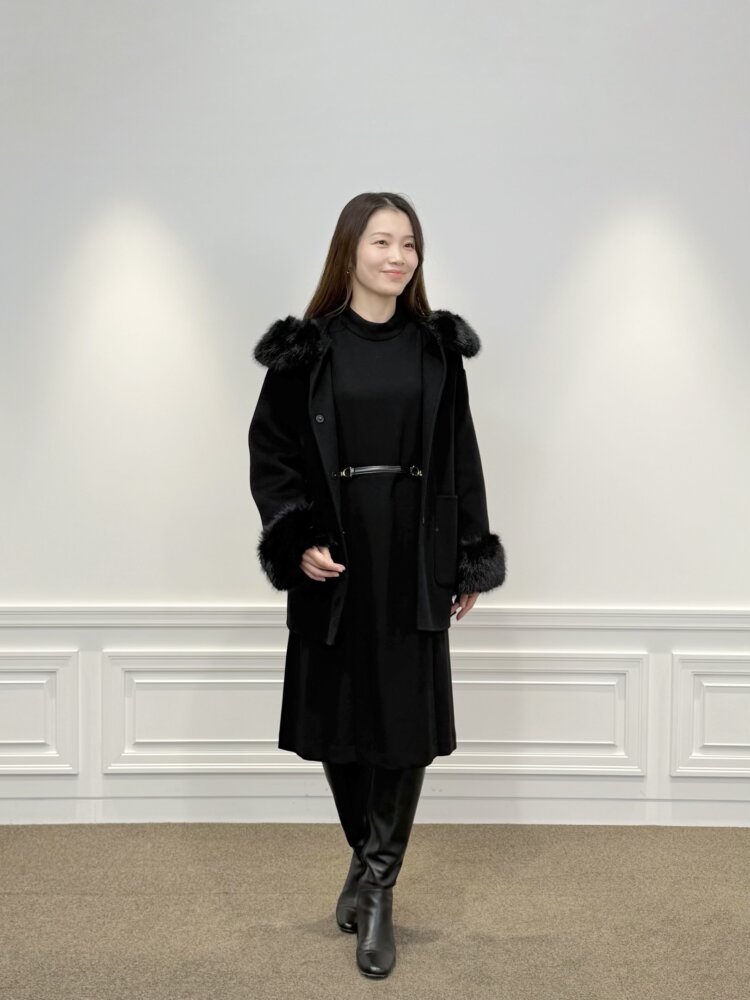上質な質感が重なり合うことで、黒でまとめたスタイルでも立体的な奥行きが生まれ、凛とした佇まいを引き立てます。異素材の組み合わせに黒のロングブーツを添えることで、全身に通る縦のラインがより強調され、オールブラックならではの洗練されたムードが一段と際立つ仕上がりに。ファーの柔らかな陰影が女性らしさを添えつつ、ワンピースの端正なシルエットが全体を引き締め、単調さのないメリハリのある大人のエレガンスを表現しています。冬のお出かけにふさわしい、品よくまとまったスタイルです。