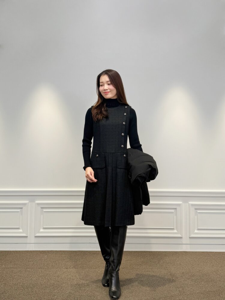 上質なミックスツイード素材が魅力の<ファニーツイードワンピース>は、今回のコーディネートの主役。フロントのボタンやフラップポケットがクラシカルなアクセントとなり、上品で都会的な存在感を放ちます。