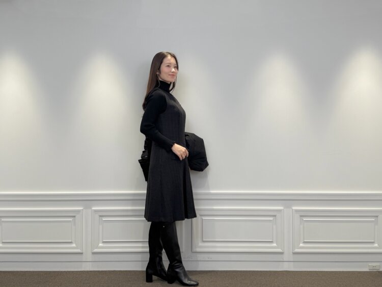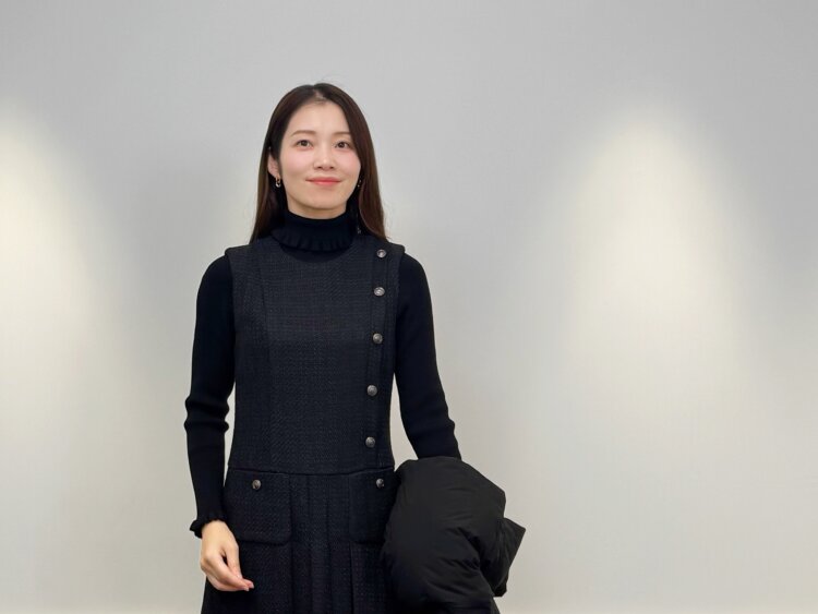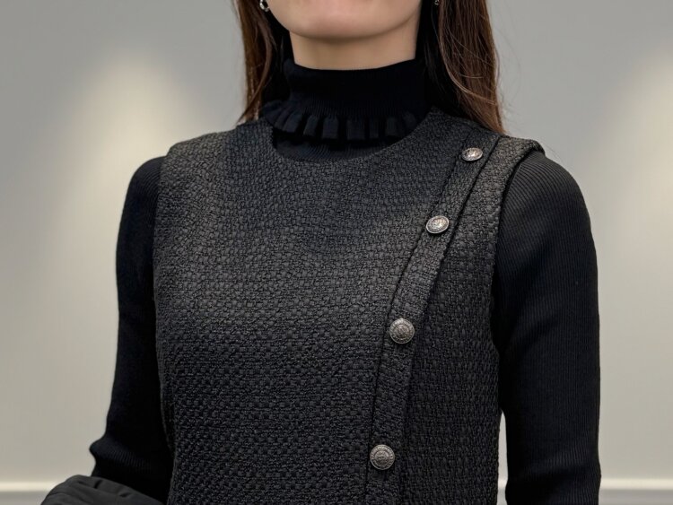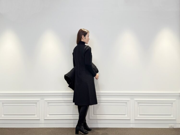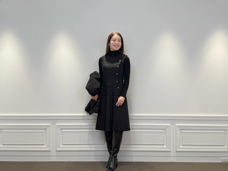 フリルとツイードが映える大人のブラック冬ワンピースコーデ