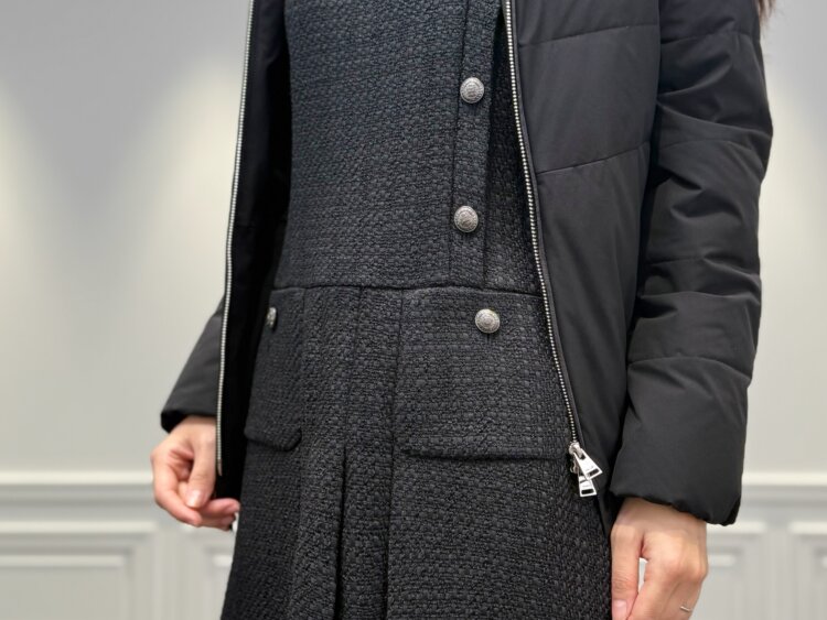 ブラックを基調に、異なる素材の奥行きを重ねたエレガントな冬の装いです。ヘムフリルが揺れるダウンコートに、華やかなツイードワンピースを合わせることで、モノトーンながら立体感のある女性らしさを演出。首元や袖にフリルを配したニットがさりげなく甘さを添え、ロングブーツでシルエットを引き締めれば、シックなお出かけスタイルが完成します。上品さと華やかさを両立した、大人のブラックレイヤードです。