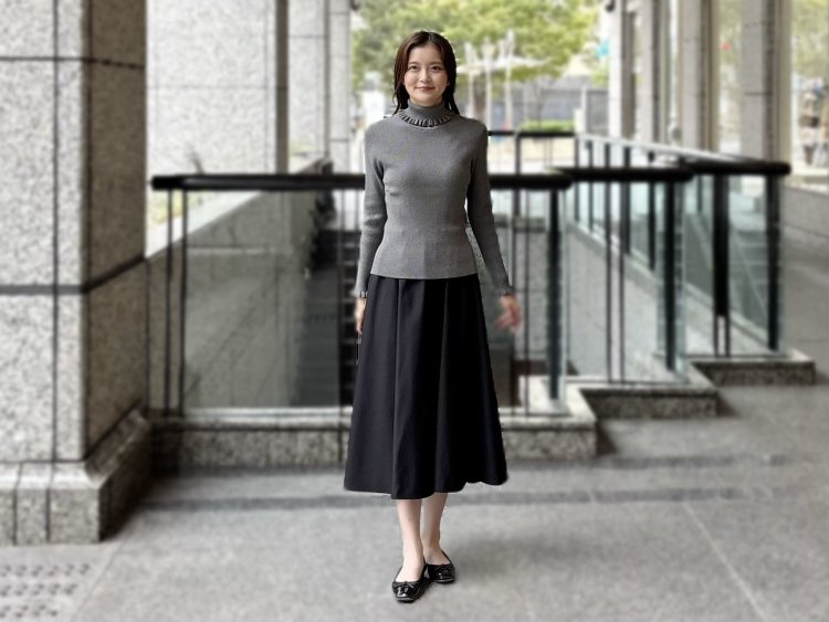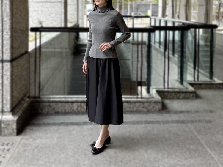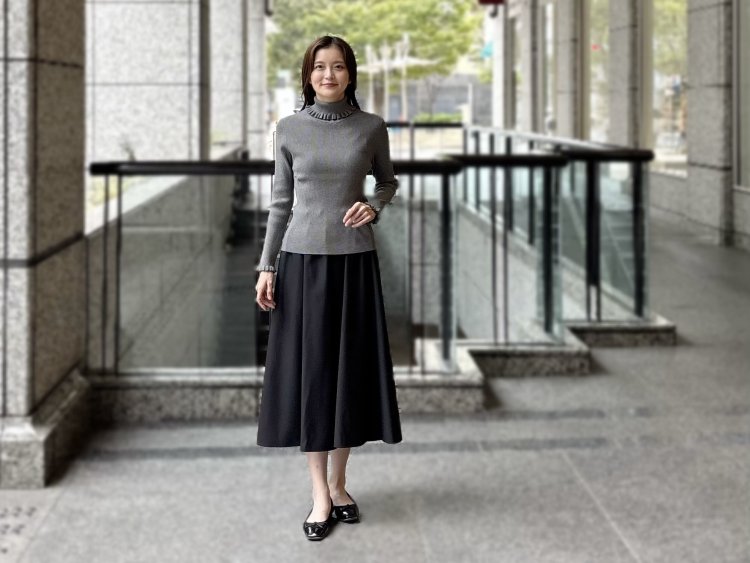 ベーシックカラーをベースにしながらも、女性らしさを引き立ててくれるこの着こなし。