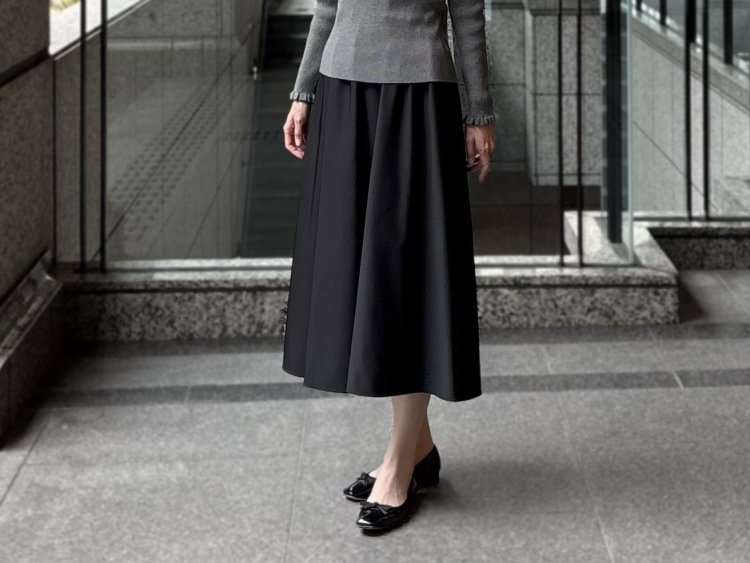 合わせたのは、しっとりとした光沢とハリ感が魅力のウエストゴムギャザーフレアスカート。